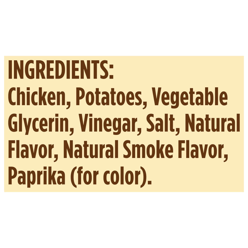 Chicken, vegetable glycerin, distilled vinegar, salt, natural smoke flavor, paprika extract color, garlic powder, mixed tocopherols (preservative), rosemary extract.Guaranteed Analysis