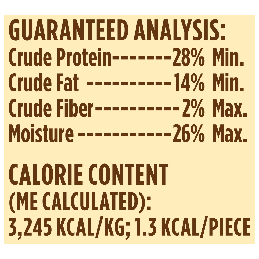 Duck, Chicken, Vegetable Glycerin, Pea Starch, Potatoes, Brewers Dried Yeast, Dried Chicken Liver, Pea Protein, Dried Chicken Broth, Gelatin, Natural Flavor, Oatmeal, Oat Fiber, Vinegar, Paprika (For Color).