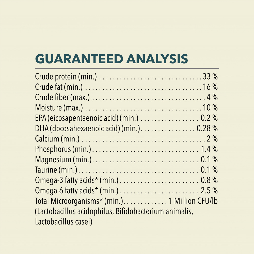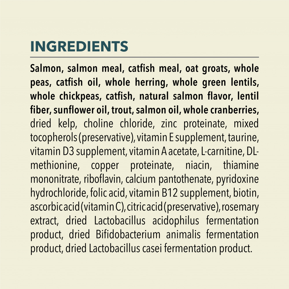 Salmon, salmon meal, catfish meal, oat groats, whole peas, catfish oil, whole herring, whole green lentils, whole chickpeas, catfish, natural salmon flavor, lentil fiber, sunflower oil, rainbow trout, salmon oil, whole cranberries, dried kelp, choline chloride, zinc proteinate, mixed tocopherols (preservative), vitamin E supplement, taurine, vitamin D3 supplement, vitamin A acetate, L-carnitine, DL-methionine, copper proteinate, niacin, thiamine mononitrate, riboflavin, calcium pantothenate, pyridoxine hydrochloride, folic acid, vitamin B12 supplement, biotin, ascorbic acid (vitamin C), citric acid (preservative), rosemary extract, dried Lactobacillus acidophilusfermentation product, dried Bifidobacterium animalisfermentation product, dried Lactobacillus caseifermentation product.