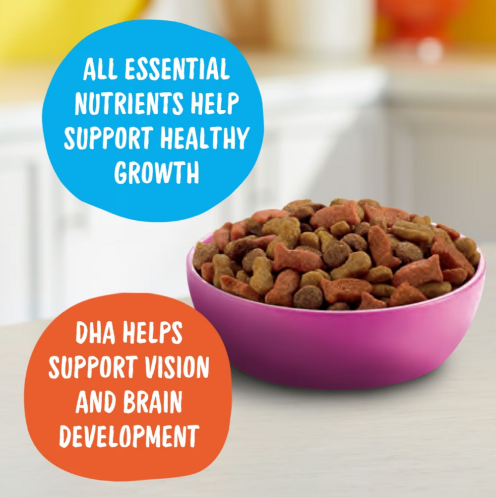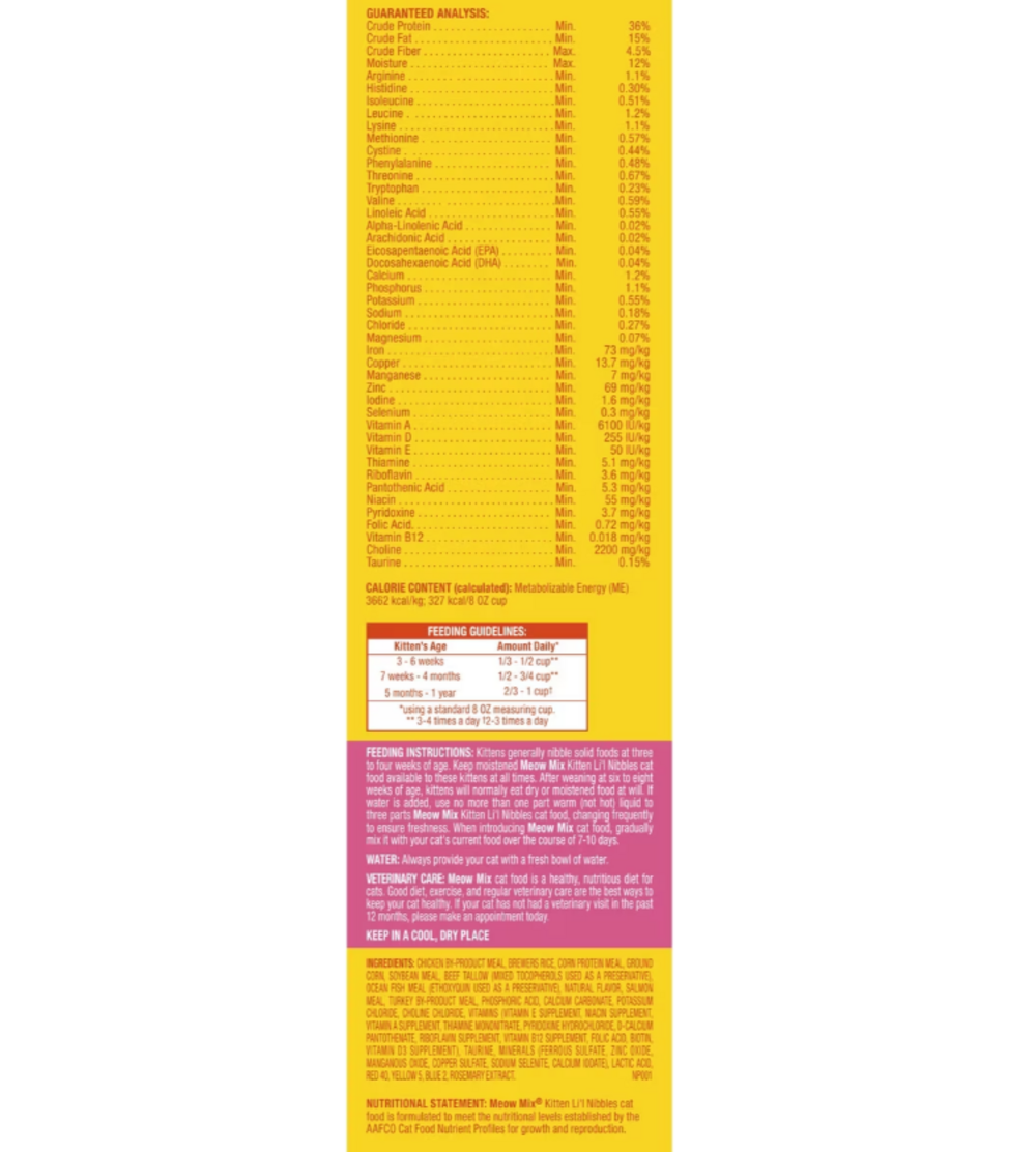 The tasty, little kibbles in Meow Mix Kitten Li'l Nibbles dry cat food contain all essential nutrients needed to help kittens grow up healthy and happy. High-quality protein and essential fatty acids help support muscle growth and healthy brain development. Wholesome ingredients and irresistible flavors make this more than just a meal...it's Meow Mix Mealtime!