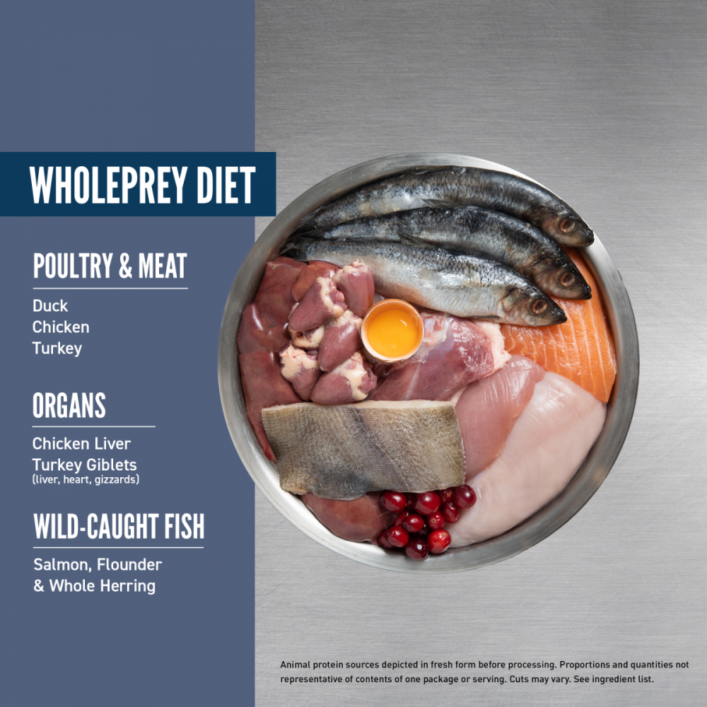 Salmon, duck, chicken, turkey, flounder, whole herring, chicken liver, eggs, dehydrated egg, dehydrated chicken, dehydrated sardine, dehydrated chicken liver, dehydrated mackerel, turkey giblets (liver, heart, gizzard), whole red lentils, whole pinto beans, whole green peas, ground whole flaxseed, whole green lentils, whole chickpeas, whole yellow peas, whole navy beans, hydrolyzed blue whiting, hydrolyzed salmon, chicken fat, chicken hearts, whole cranberries, choline chloride, dried kelp, vitamin E supplement, mixed tocopherols (preservative), whole pumpkin, whole apples, collard greens, whole butternut squash, whole pears, zinc proteinate, dried chicory root, niacin, thiamine mononitrate, riboflavin, calcium pantothenate, pyridoxine hydrochloride, folic acid, vitamin B12 supplement, copper proteinate, turmeric, sarsaparilla root, althea root, rosehips, juniper berries, citric acid (preservative), rosemary extract, dried Lactobacillus acidophilus fermentation product, dried Bifidobacterium animalis fermentation product, dried Lactobacillus casei fermentation product.