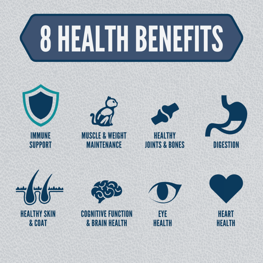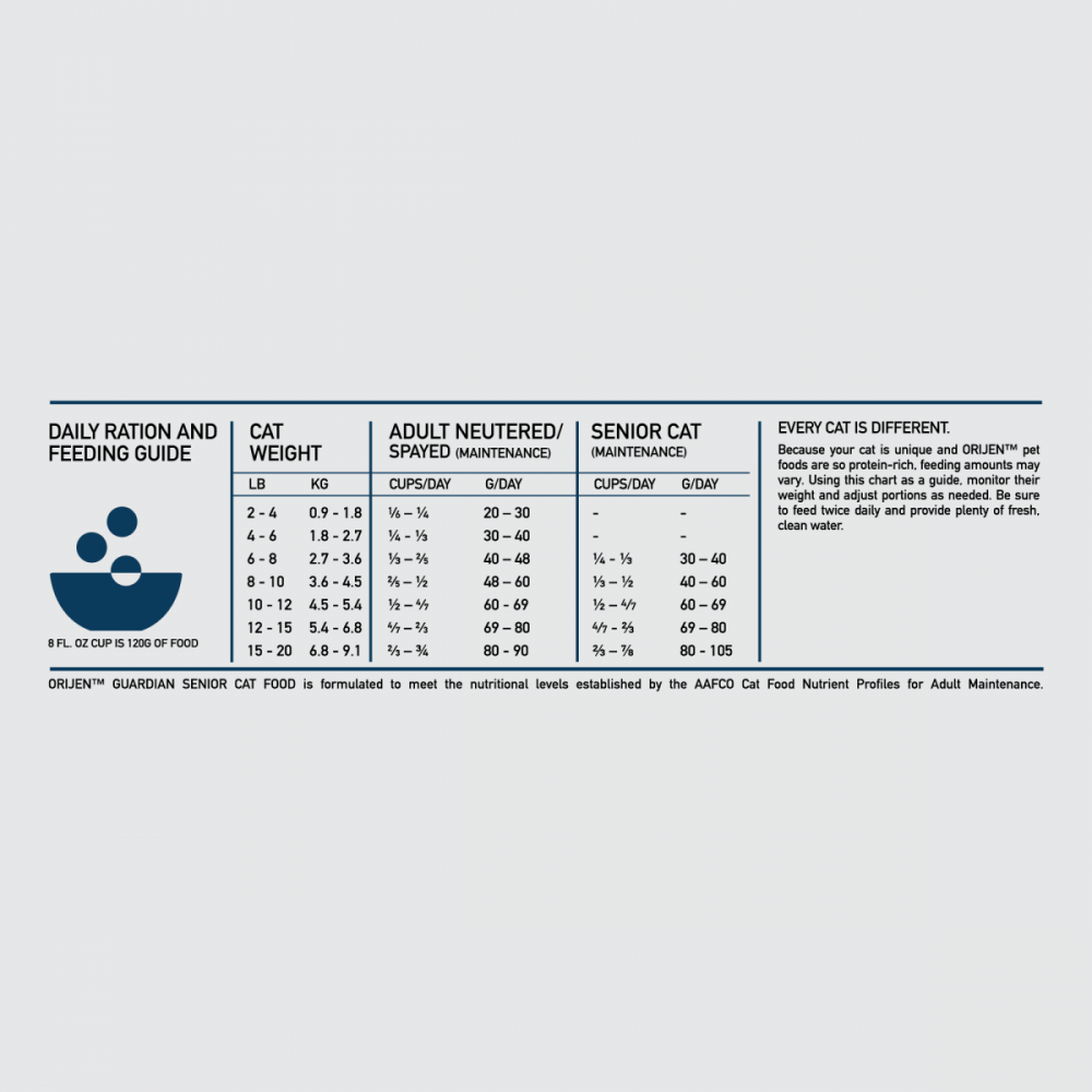Help guard your senior cat's vitality with ORIJEN. Guardian Senior diet, specially formulated to support your cat's unique needs as they grow older. Ideal for cats 7+, this diet is packed with nourishing fresh or raw animal ingredients including wild-caught salmon, duck and free-run* chicken to provide your mature cat with the protein they need to thrive. And with succulent and nutrient-rich WholePrey ingredients like organs and bone, it helps target 8 key health benefits that help keep your mature cat supported and vital as they grow older with you. *Our free-run chickens and turkeys are not housed in cages and are able to move in a barn without outdoor access.**Approximate and derived from the unprocessed state of the ingredients Our fresh ingredients use refrigeration as the sole method of preservation and our raw ingredients are frozen at their peak freshness.ORIJEN Freeze-Dried Treats are made from 100%* raw animal ingredients freeze-dried to lock in their protein and nutrients. Packed with WholePrey animal ingredients like muscle meat, organs and bone, these treats come in a convenient, freeze-dried form to make it easy for you to fuel your cat on any adventure.