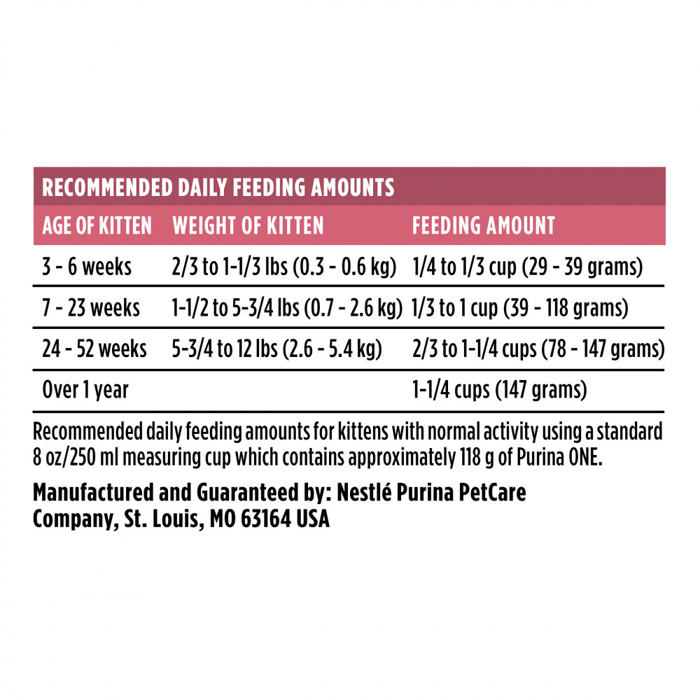 Give your growing kitten the nutrition she needs and a taste she loves when you serve Purina ONE Healthy Kitten Formula dry cat food. Real chicken as the first ingredient gives your budding feline the delectable taste cats love while providing her with the high-quality protein you demand from a veterinarian-recommended brand. This natural kitten formula plus essential nutrients is crafted with accents of real vegetables, including real carrots and peas, and without artificial flavors or preservatives. It's made with DHA, a nutrient found in mother's milk, which assists with brain and vision development. This formula also has an antioxidant-rich blend of vitamins E and A and other nutrients that help support a strong immune system. Your little friend is sure to love the enticing texture of the crunchy kibble, and you can feel good about giving her 100% complete and balanced nutrition for kittens to help support her overall health and wellness.Show your kitten just how much she means to you by filling her dish with Purina ONE Healthy Kitten Formula dry cat food. With 46 grams of protein per cup, this kitten food helps support her strong muscles, including a healthy heart. Kittens love the texture of this tasty recipe, which is crafted with real ingredients like real chicken, wholesome grains and accents of real vegetables. The crunchy kibble helps reduce plaque buildup and whiten teeth. Omega-6 fatty acids in every serving help give your kitten a radiant coat and healthy skin, and the formula is highly-digestible, so more nutrition goes to work inside your cat. Because it's made with 0% fillers, this dry kitten food ensures all of our high-quality ingredients have a purpose. Kittens generally nibble solid foods at three to four weeks of age. Keep moistened Purina ONE available to these kittens at all times. After weaning, at six to eight weeks of age, kittens normally eat dry or moistened food at will. Add variety to her diet with our menu of Purina ONE wet cat foods, including Purina ONE True Instinct Turkey Recipe in Gravy. Giving your cat the nutrition she needs to be happy and healthy is your first concern, and Purina ONE dry kitten food does just that. We craft this recipe in our U.S. facilities, so you know exactly where her meals are made. In a typical 24-hour production, Nestle Purina conducts 30,000 quality checks, so you know your precious kitten is getting the delicious and nutritious food she deserves. We formulate this Purina ONE recipe to meet or exceed all state and federal guidelines for pet food, and we put quality first in everything we do. Offer Purina ONE Healthy Kitten Formula dry cat food to your furry friend, and watch as she devours every last scrumptious bite.