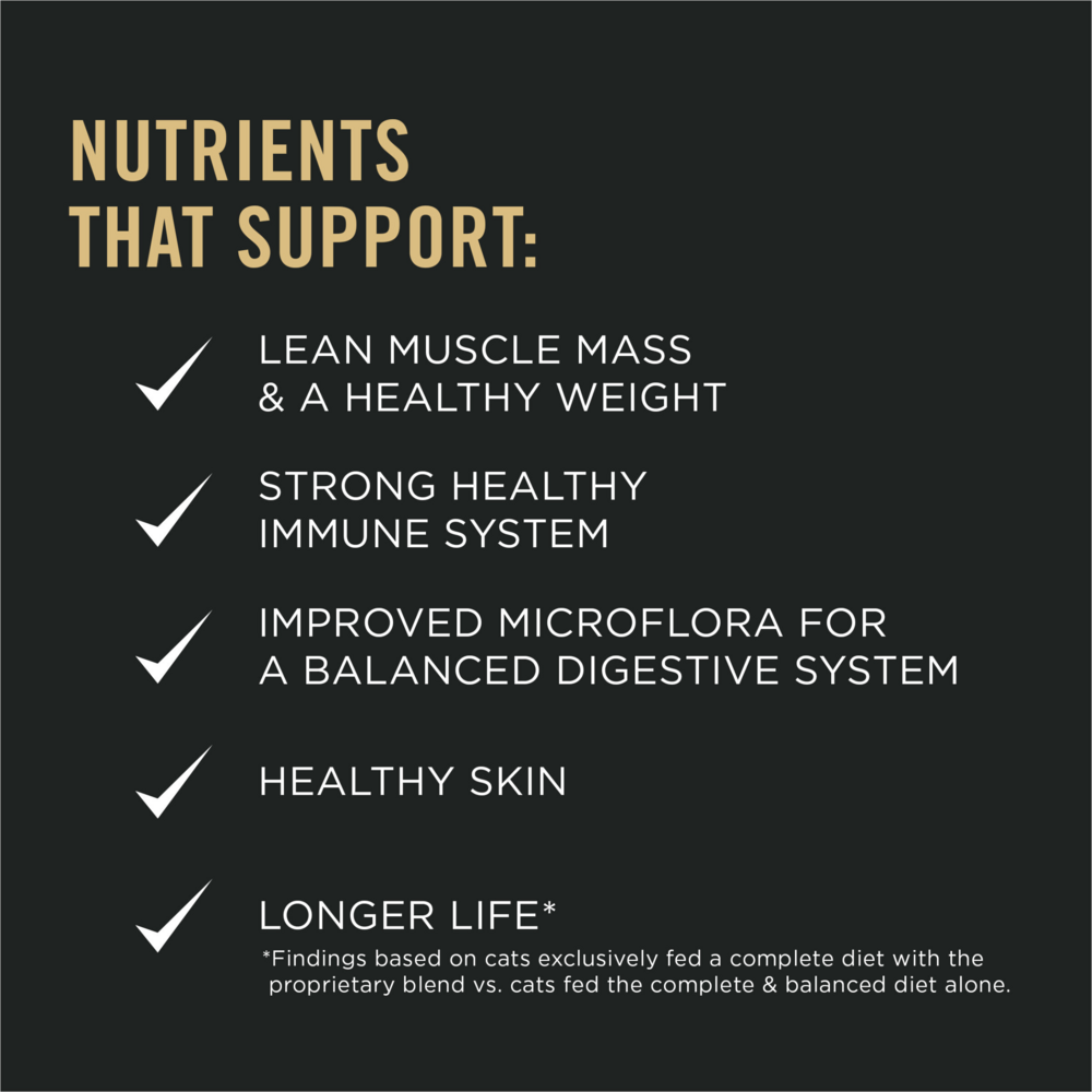 Serve your feline friend Purina Pro Plan Prime Plus Adult 7+ Chicken & Rice Formula dry cat food, and watch her enjoy every bite to the bottom of her bowl. This dry cat food contains a unique blend that has been proven in a 9-year study to improve and extend the lives of cats age 7+. It has all the protein your cat needs to promote lean muscle mass and help maintain a healthy weight. Featuring chicken as the #1 ingredient, the Chicken & Rice recipe is sure to impress, while giving her the balanced nutrition she needs. Our formula includes the antioxidants beta carotene and vitamin E, omega-3 fatty acids from fish oil along with omega-6 fatty acids from soybean oil, and prebiotic fiber from chicory root. This formula also contains key nutrients to help support her immune system, improve the microflora in her stomach to help maintain a balanced digestive system, and help to support your cat's healthy skin.