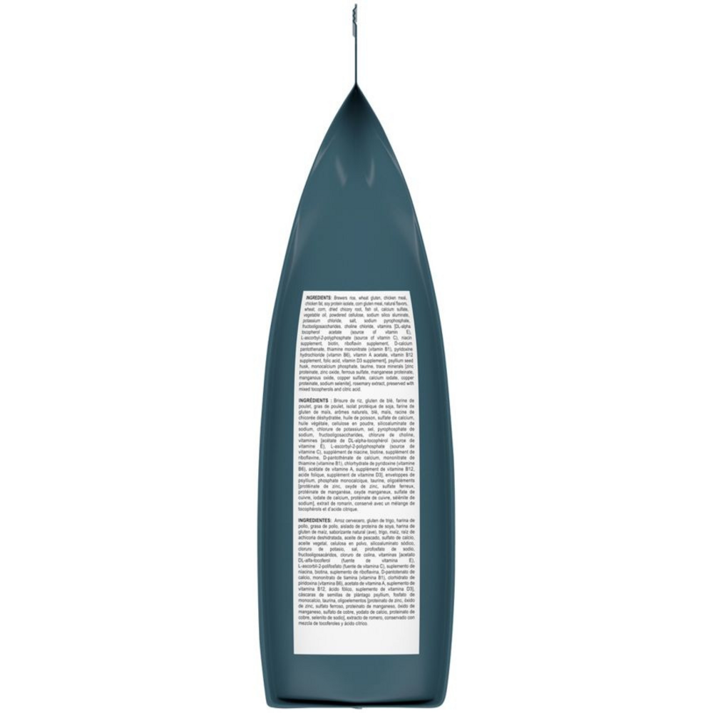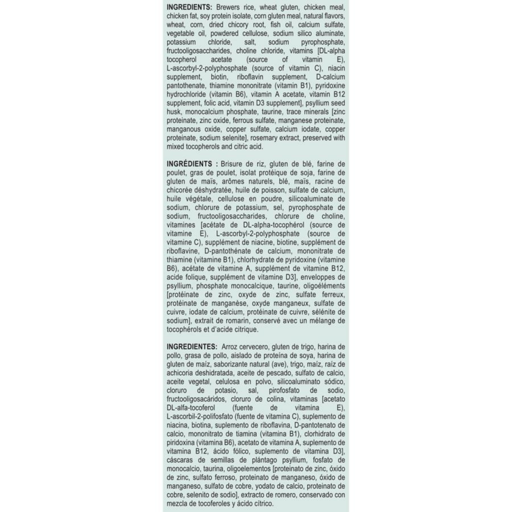 Brewers rice, wheat gluten, chicken meal, chicken fat, soy protein isolate, corn gluten meal, natural flavors, wheat, corn, dried chicory root, fish oil, calcium sulfate, vegetable oil, powdered cellulose, sodium silico aluminate, potassium chloride, salt, sodium pyrophosphate, fructooligosaccharides, choline chloride, vitamins [DL-alpha tocopherol acetate (source of vitamin E), L-ascorbyl-2-polyphosphate (source of vitamin C), niacin supplement, biotin, riboflavin supplement, D-calcium pantothenate, thiamine mononitrate (vitamin B1), pyridoxine hydrochloride (vitamin B6), vitamin A acetate, vitamin B12 supplement, folic acid, vitamin D3 supplement], psyllium seed husk, monocalcium phosphate, taurine, trace minerals [zinc proteinate, zinc oxide, ferrous sulfate, manganese proteinate, manganous oxide, copper sulfate, calcium iodate, copper proteinate, sodium selenite], rosemary extract, preserved with mixed tocopherols and citric acid.