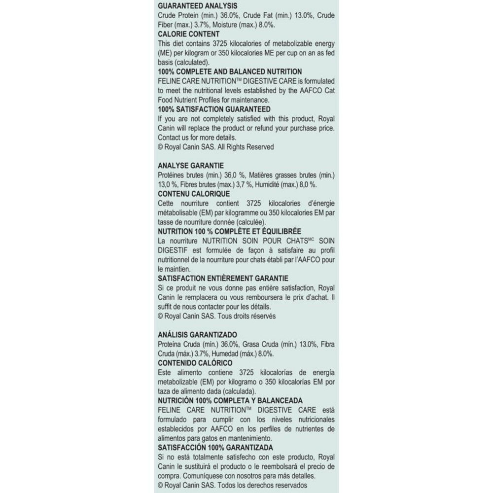 Cats can be very good at hiding what’s ailing them. However, you can find clues in their litter box. Lots of stinky stools could mean your cat has a sensitive stomach and digestive tract. Sometimes regurgitation can be an indicator that your cat is eating too fast to even digest and absorb the nutrients they need. Regular regurgitation may indicate a more serious issue, and you should consult your veterinarian.Royal Canin Digestive Care dry cat food is made for cats with sensitive stomachs that tend to scarf down and regurgitate their food. The exclusive ring-shaped cat kibble encourages your cat to slow down and chew thoroughly. And highly digestible proteins, including a blend of prebiotics and dietary fibers, help balance the intestinal tract for healthy digestion. This precise diet is proven to be effective after 10 days with over 95% healthy stool quality. Try pairing with Royal Canin Digest Sensitive wet cat food formulas for a meal your cat will love.With nearly 50 years of scientific research and observation, Royal Canin continues to deliver targeted nutrition to feed every pet’s magnificence. Not satisfied? Then neither are we. Our formulas are 100% satisfaction guaranteed. Royal Canin Digestive Care dry cat food is formulated for cats 1 year and older with sensitive stomachsPromotes digestive health with an optimal blend of prebiotics and dietary fibersProven effective after 10 days with over 95% healthy stool qualityExclusive ring-shaped kibble encourages slower eating to help support healthy digestionPerfect complement to Royal Canin Digest Sensitive wet cat food formulas