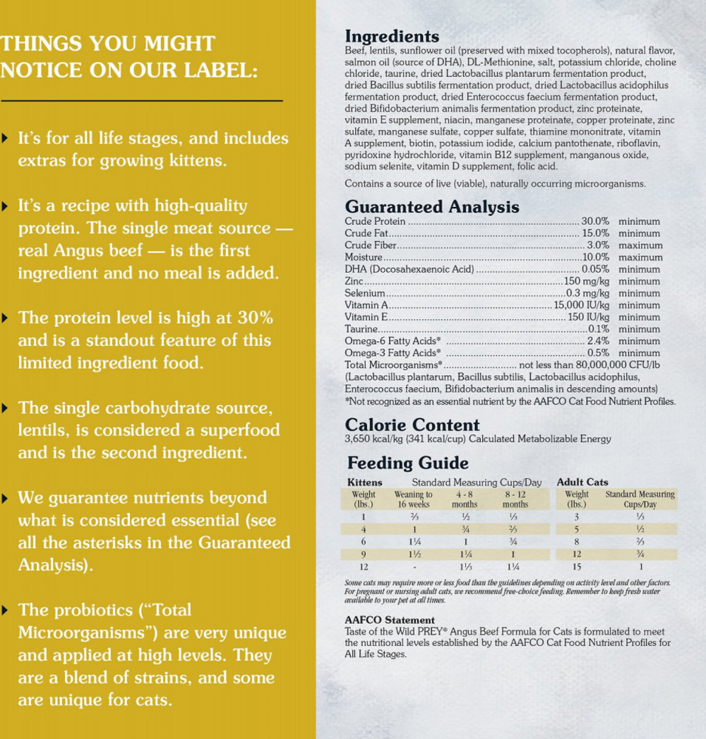 Whether your cat has experienced food sensitivities or you just prefer to offer your pet a wholesome, simple diet, a limited ingredient cat food offers many benefits. This simplified recipe delivers complete nutrition with just three key ingredients, carefully selected vitamins and minerals, and guaranteed probiotics, which also help support digestion. 98% of the protein in this recipe comes from pasture-raised Angus beef (55%) and lentils (43%), while chicken fat delivers omega fatty acids and enhances flavor. Finally, this grain-free recipe* is free of GMO ingredients, and does not contain any added artificial colors, flavors or preservatives.*The facility in which this food is made also makes food that may contain other ingredients, such as grains. Trace amounts of these other ingredients may be present.