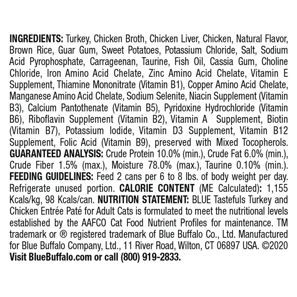 - DELICIOUS TURKEY FIRST: The first ingredient in this BLUE Tastefuls cat food recipe is protein-rich turkey to support healthy muscle maintenance ; SAVORY PATÉ: Tastefuls wet cat food featuring a smooth, silky texture is so flavorful even finicky felines will come back for more. One taste is all it takes!