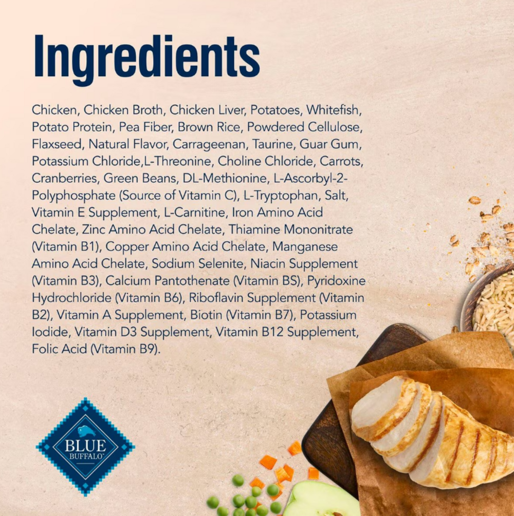 Chicken, Chicken Broth, Chicken Liver, Potatoes, Whitefish, Potato Protein, Pea Fiber, Brown Rice, Powdered Cellulose, Flaxseed, Natural Flavor, Carrageenan, Taurine, Guar Gum, Potassium Chloride, L-Threonine, Choline Chloride, Carrots, Cranberries, Green Beans, DL-Methionine, L-Ascorbyl-2-Polyphosphate (source of Vitamin C), L-Tryptophan, Salt, Vitamin E Supplement, L-Carnitine, Iron Amino Acid Chelate, Zinc Amino Acid Chelate, Thiamine Mononitrate (Vitamin B1), Copper Amino Acid Chelate, Manganese Amino Acid Chelate, Sodium Selenite, Niacin Supplement (Vitamin B3), Calcium Pantothenate (Vitamin B5), Pyridoxine Hydrochloride (Vitamin B6), Riboflavin Supplement (Vitamin B2), Vitamin A Supplement, Biotin (Vitamin B7), Potassium Iodide, Vitamin D3 Supplement, Vitamin B12 Supplement, Folic Acid (Vitamin B9).Guaranteed Analysis