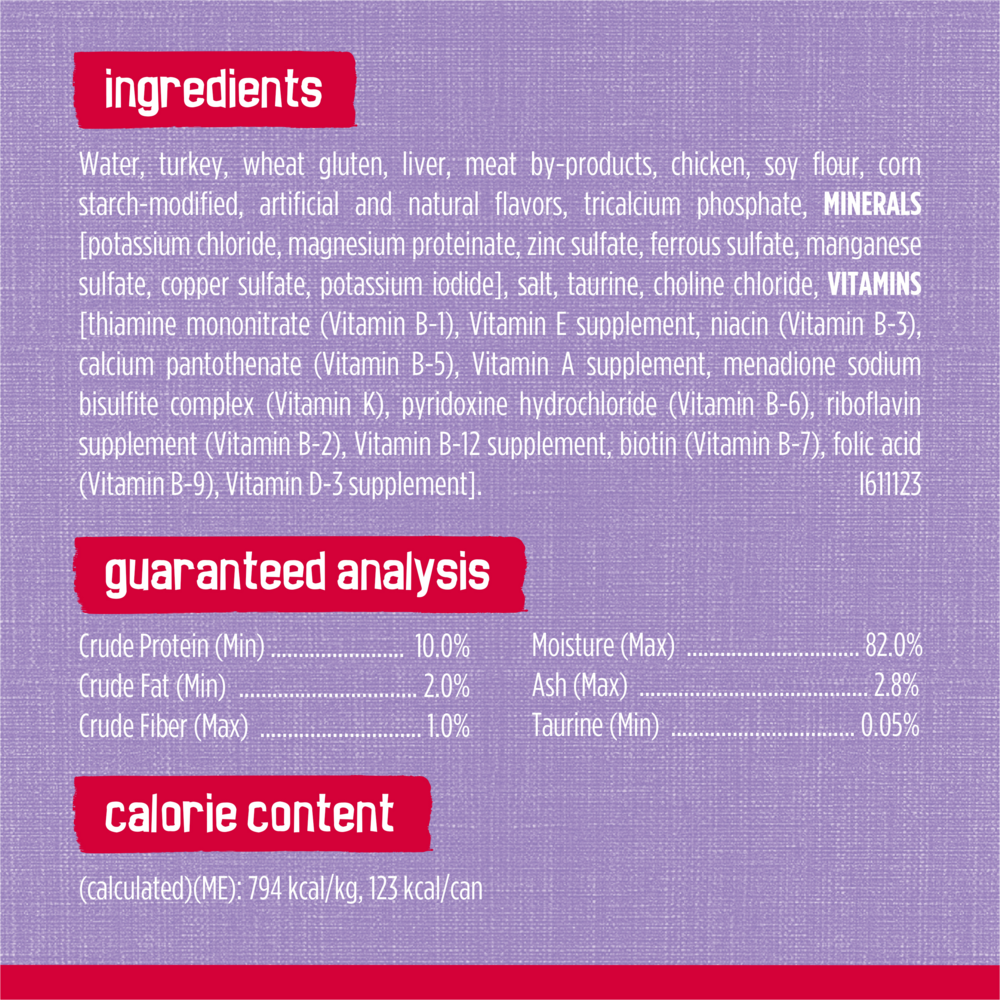 Water, Turkey, Liver, Wheat Gluten, Meat By-Products, Chicken, Soy Flour, Corn Starch-Modified, Artificial And Natural Flavors, Tricalcium Phosphate, Added Color, Minerals [Potassium Chloride, Mono And Dicalcium Phosphate, Magnesium Sulfate, Zinc Sulfate, Ferrous Sulfate, Copper Sulfate, Manganese Sulfate, Potassium Iodide], Taurine, Choline Chloride, Salt, Vitamins [Thiamine Mononitrate (Vitamin B-1), Vitamin E Supplement, Niacin (Vitamin B-3), Calcium Pantothenate (Vitamin B-5), Vitamin A Supplement, Menadione Sodium Bisulfite Complex (Vitamin K), Pyridoxine Hydrochloride (Vitamin B-6), Riboflavin Supplement (Vitamin B-2), Vitamin B-12 Supplement, Biotin (Vitamin B-7), Folic Acid (Vitamin B-9), Vitamin D-3 Supplement].