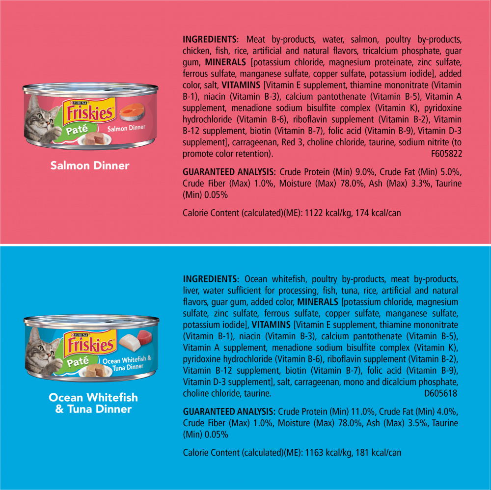 It's anchors aweigh for your cat when you fill your pantry with this Purina Friskies Seafood wet cat food variety pack. Four mouthwatering recipes from our Purina Friskies Pate line bring the flavors of the ocean to your cat's dish, giving her more of the fish tastes she craves. A smooth, pleasing pate texture gives her something scrumptious to sink her teeth into, and the intoxicating aroma tells her that something scrumptious is right around the corner. Rest easy knowing she's getting 100% complete and balanced nutrition for adult cats and kittens in every serving, and watch as she delights in the tempting flavors that are sure to make this wet cat food collection an instant hit for your cat companion. Let her choose a favorite recipe at mealtime, and show her you pay attention to her cravings for rich, delicious seafood flavors.Fill your galley with the seafaring flavors found in this Purina Friskies Seafood wet cat food variety pack. Each package contains four Purina Friskies Pate recipes, including Ocean Whitefish & Tuna Dinner, Mariner's Catch, Salmon Dinner and Sea Captain's Choice. Each variety features an assortment of fish flavors sure to satisfy her hunger, and the pate texture invites her to nibble her way to the bottom of her dish at feeding time. With essential vitamins and minerals in every serving, this wet cat food collection lets you feel good about the foods you serve to your cat companion. The 32-count package offers a convenient way to keep your pantry stocked for your feline family, and the pull-tab cans allow for easy serving. Offer a different recipe as your cat's main entree at feeding time, or rotate between wet and dry foods with our mouthwatering Purina Friskies 7 dry cat food to give her even more tastes and textures to love. We believe that life is better with pets, and that's why we work to make quality the number one ingredient in everything we produce. Each recipe in this collection is formulated to meet or exceed industry standards for cat food, so you can rest easy knowing she's getting meals that are as nutritious as they are delicious. Our team of experts performs rigorous quality and safety checks at every step in the production process to ensure your cat's foods are safe. At Purina, we value sustainability, and that's one reason that every can in this wet cat food collection is conveniently recyclable. Your purchases can help you to make a positive impact on the environment while giving your cat the delicious, nourishing foods she deserves. Make this Purina Friskies Seafood wet cat food variety pack part of your cat's regular diet, and let her know just how much her health and happiness mean to you.