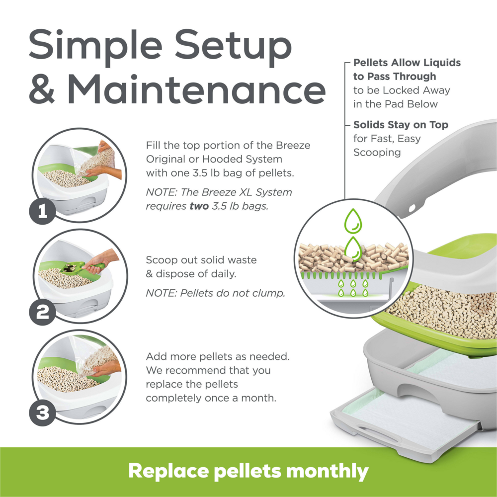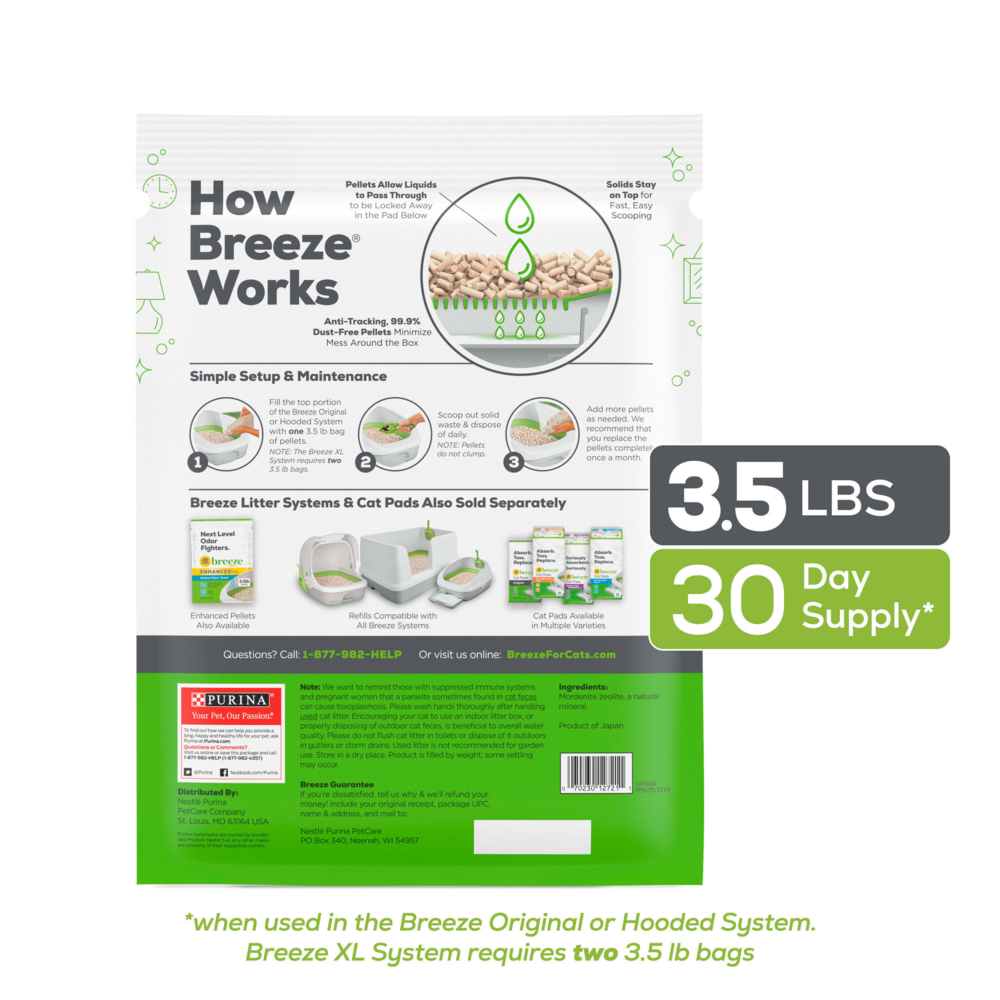 Control odor and make cleaning up your cat's litter box a hassle-free task with this Purina Tidy Cats BREEZE cat litter pellets refill. Designed to work with the Tidy Cats BREEZE litter system (sold separately), these litter pellets allow urine to pass through, leaving solid waste on top. This makes scooping your BREEZE litter system quick and easy. These pellets are 99.9% dust-free, so they pour cleanly into your automatic cat litter box without leaving a mess behind. Designed to dehydrate solid waste, these litter pellets help to keep your cats' litter boxes clean and tidy. They are formulated for multiple-cat households, so your feline family is happy and willing to make use of their cat corner. Featuring outstanding odor control, these pellets help to keep your home smelling crisp and clean. Check litter box maintenance off your to-do list with these innovative litter pellets.Stock up on the essentials you need for your Tidy Cats BREEZE litter system (sold separately) with this Purina Tidy Cats BREEZE cat litter pellets refill. These pellets allow urine to pass through to an absorbent pad underneath to control odors, leaving your cat's litter area pleasant and inviting. This also helps to keep your cat dry and comfortable when using the automatic litter box. With low tracking, these pellets prevent messes outside of each litter box so your floors stay clean. Because these pellets help to dehydrate solid waste, scooping and cleaning your cats' litter boxes is a simple, quick task. Each bag lasts for up to one month, and the convenient packaging makes it easy to store this pellets refill in your closet or pantry. Show your cats you care about their comfort and happiness when you use these litter pellets in conjunction with your Tidy Cats BREEZE litter system. Tending to your feline family's needs doesn't have to be difficult. With these litter pellets, you can spend less time cleaning and more time playing with your cat companions. If you are using the Tidy Cats BREEZE litter system for the first time, introduce these pellets gradually to your cat's existing litter, so they can become familiar with the new scent and texture. Follow the included instructions on the packaging to ensure a smooth transition. We recommend removing solid waste daily and cleaning each box with warm water and a mild detergent between litter changes. Store your litter pellets in a dry place for optimal performance, and keep an ample supply available so you can switch out the litter in each cat's box as needed. Rethink the way you approach litter, and put this Purina Tidy Cats BREEZE cat litter pellets refill to work in your home for a fresh, clean way to tend to your cats' personal needs.
