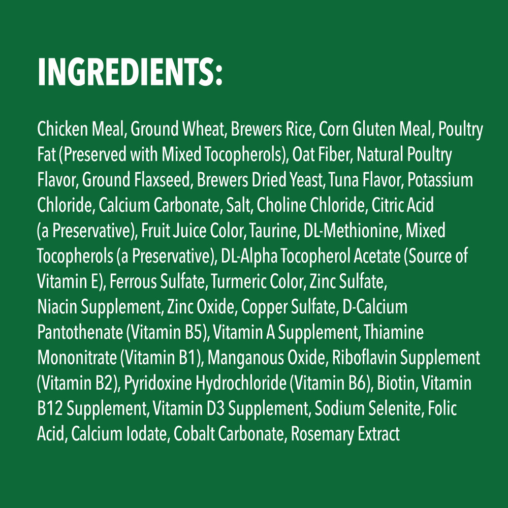 Chicken Meal, Ground Wheat, Brewers Rice, Corn Gluten Meal, Poultry Fat (Preserved with Mixed Tocopherols), Oat Fiber, Natural Poultry Flavor, Ground Flaxseed, Brewers Dried Yeast, Tuna Flavor, Potassium Chloride, Calcium Carbonate, Salt, Choline Chloride, Citric Acid (a Preservative), Fruit Juice Color, Taurine, DL-Methionine, Mixed Tocopherols (a Preservative), DL-Alpha Tocopherol Acetate (Source of Vitamin E), Ferrous Sulfate, Turmeric Color, Zinc Sulfate, Niacin Supplement, Zinc Oxide, Copper Sulfate, D-Calcium Pantothenate (Vitamin B5), Vitamin A Supplement, Thiamine Mononitrate (Vitamin B1), Manganous Oxide, Riboflavin Supplement (Vitamin B2), Pyridoxine Hydrochloride (Vitamin B6), Biotin, Vitamin B12 Supplement, Vitamin D3 Supplement, Sodium Selenite, Folic Acid, Calcium Iodate, Cobalt Carbonate, Rosemary Extract
