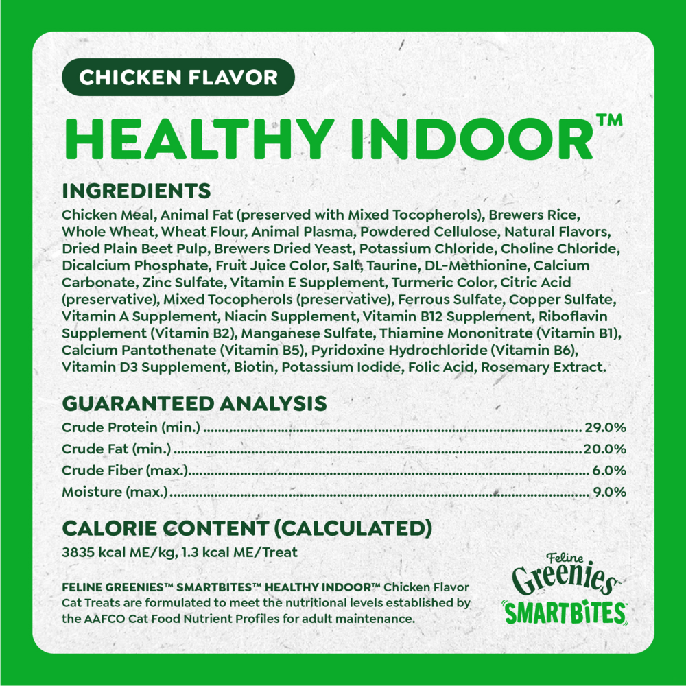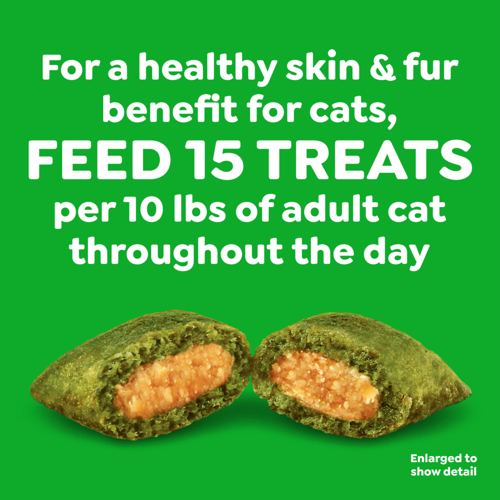 FELINE GREENIES SMARTBITES Hairball Control Treats for Cats are the perfect treat to keep your cat purring all day long. Designed by veterinarians and created with GREENIES FIBERBLEND Formula, these treats help minimize and control hairball formation and support healthy digestion in your adult cat when fed in conjunction with a hairball control diet. Featuring a mix of crunchy and creamy textures, these cat snacks have less than 2 calories, and added vitamins, minerals, and other nutrients for a nutritionally complete and balanced snack. Plus, these irresistible little treats come in a delectable chicken flavor and are made with natural ingredients, plus vitamins. These FELINE GREENIES are the healthy, tasty hairball control treats your cat will love.