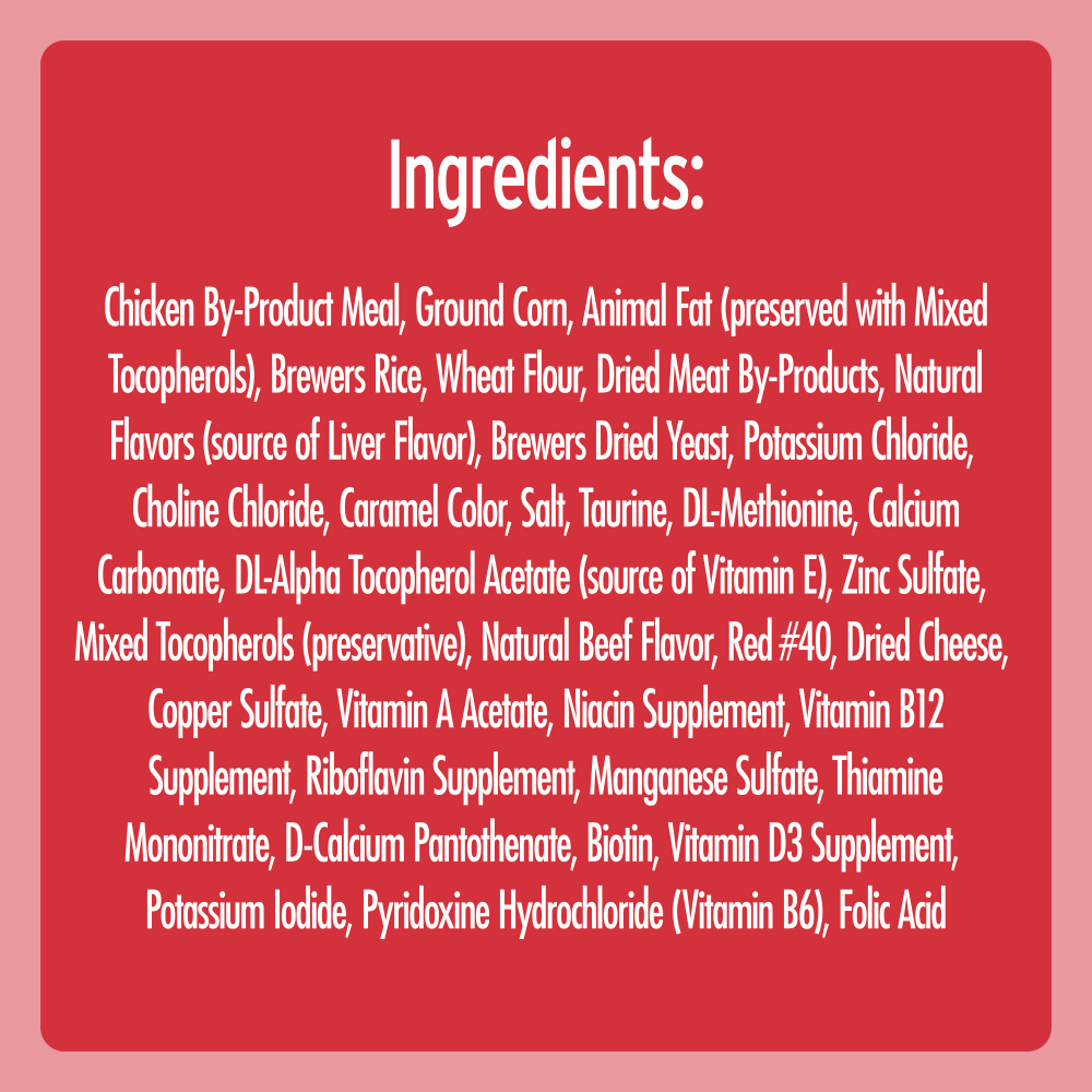 Chicken By-Product Meal, Ground Corn, Animal Fat (preserved with Mixed Tocopherols), Brewers Rice, Wheat Flour, Dried Meat By-Products, Natural Flavors (source of Liver Flavor), Brewers Dried Yeast, Potassium Chloride, Choline Chloride, Caramel Color, Salt, Taurine, DL-Methionine, Calcium Carbonate, DL-Alpha Tocopherol Acetate (source of Vitamin E), Zinc Sulfate, Mixed Tocopherols (preservative), Natural Beef Flavor, Red #40, Dried Cheese, Copper Sulfate, Vitamin A Acetate, Niacin Supplement, Vitamin B12 Supplement, Riboflavin Supplement, Manganese Sulfate, Thiamine Mononitrate, D-Calcium Pantothenate, Biotin, Vitamin D3 Supplement, Potassium Iodide, Pyridoxine Hydrochloride (Vitamin B6), Folic Acid