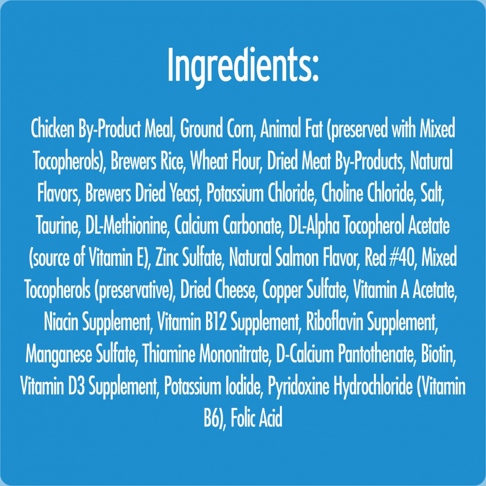 Chicken By-Product Meal, Ground Corn, Animal Fat (preserved with Mixed Tocopherols), Rice, Dried Meat by-Products, Wheat Flour, Natural Flavors, Corn Gluten Meal, Potassium Chloride, Choline Chloride, Salt, Salmon Meal (preserved with BHA/BHT), Calcium Carbonate, Taurine, DL-Methionine, Vitamins (dl-Alpha Tocopherol Acetate [Source of Vitamin E], Vitamin A Acetate, Niacin Supplement, Vitamin B12 Supplement, Riboflavin Supplement, Thiamine Mononitrate, d-Calcium Pantothenate, Vitamin D3 Supplement, Biotin Supplement, Pyridoxine Hydrochloride [Vitamin B6], Folic Acid Supplement), Minerals (Zinc Sulfate, Copper Sulfate, Manganese Sulfate, Potassium Iodide), Iron Oxide, Shrimp Meal.