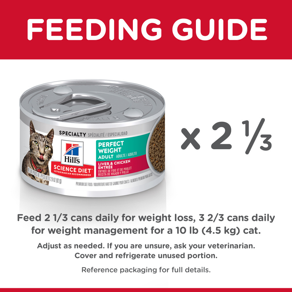 Give your grown cat the weight loss nutrition they need with a taste they can't resist. Hill's Science Diet Adult Perfect Weight Liver & Chicken Entree wet food provides your adult cat with breakthrough weight management nutrition using real chicken and vegetables. This canned cat food made with natural ingredients provides clinically proven technology for healthy weight maintenance & long-lasting weight support. In fact, 70% of cats have shown visible results within 10 weeks. There’s more to love with the new look of Science Diet®. Some of our products also have new names, new kibble shapes & new formulas. • A breakthrough weight management food for adult cats • Cats lost weight with visible results within 10 weeks • Provides healthy weight maintenance & long lasting weight support • Scrumptious wet food made with natural ingredients • Switch up meal time with Hill's Science Diet Adult Perfect Weight Roasted Vegetable & Chicken Medley•#1 Veterinarian RecommendedOver 70% of cats lost weight within 10 weeks when fed this nutrition