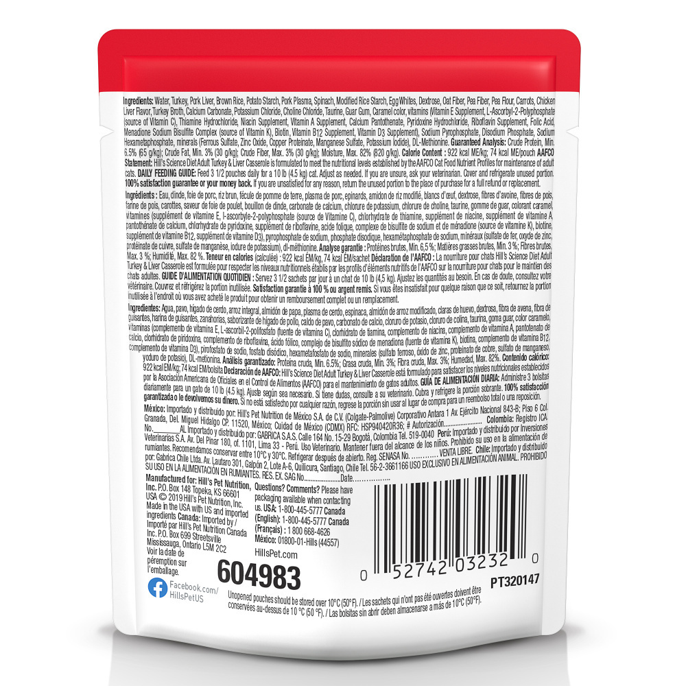 Now Science Diet wet cat food comes in a pouch that’s easy to open and easy to feed. Even the most picky eaters will love this soft and tender cat food casserole, with delicious morsels of turkey, brown rice, carrots and spinach in a decadent gravy. Made in the USA with global ingredients you can trust, this food uses clinically proven antioxidants vitamins C+E for a healthy immune system. It’s the perfect option for adult cats ages 1-6 ready to switch from kitten food. Serve this gourmet daily nutrition as a balanced meal by itself, or try it on top of Science Diet dry adult food. • Biology-based nutrition of Science Diet in an irresistible wet cat food • Easy to open, easy to feed single-serve pouch • High-quality protein to help adult cats ages 1-6 maintain lean muscle • Perfect taste and texture, even for picky eaters • Great-tasting, easily digestible natural ingredients with added vitamins, minerals and amino acids • Made in the USA with global ingredients you can trust • From Hill’s, the #1 Veterinarian Recommended pet food brand