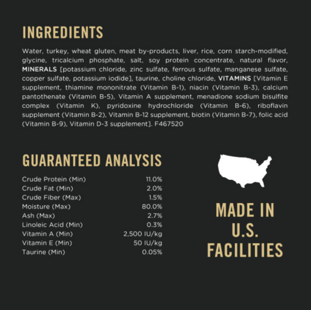 Water sufficient for processing, turkey, liver, wheat gluten, tomatoes, meat by-products, carrots, spinach, chicken, corn starch-modified, artificial and natural flavors, soy flour, salt, tricalcium phosphate, potassium chloride, taurine, added color, choline chloride, Vitamin E supplement, thiamine mononitrate, zinc sulfate, ferrous sulfate, niacin, calcium pantothenate, Vitamin A supplement, menadione sodium bisulfite complex (source of Vitamin K activity), copper sulfate, manganese sulfate, pyridoxine hydrochloride, riboflavin supplement, Vitamin B-12 supplement, biotin, folic acid, Vitamin D-3 supplement, and potassium iodide