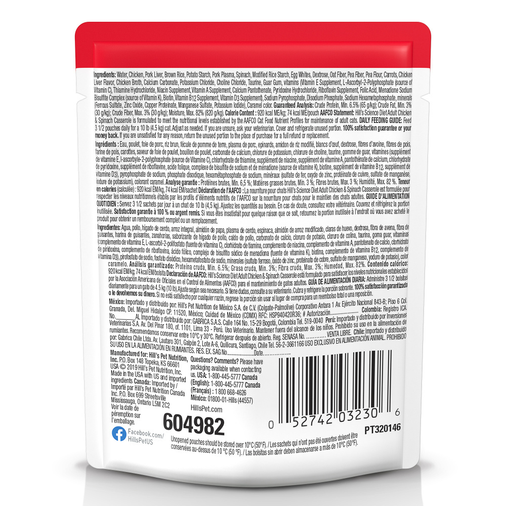Now Science Diet wet cat food comes in a pouch that’s easy to open and easy to feed. Even the most picky eaters will love this soft and tender cat food casserole, with delicious morsels of chicken, brown rice, carrots and spinach in a decadent gravy. Made in the USA with global ingredients you can trust, this food uses clinically proven antioxidants vitamins C+E for a healthy immune system. It’s the perfect option for adult cats ages 1-6 ready to switch from kitten food. Serve this gourmet daily nutrition as a balanced meal by itself, or try it on top of Science Diet adult dry food. Biology-based nutrition of Science Diet in an irresistible wet cat food • Easy to open, easy to feed single-serve pouch • High-quality protein to help adult cats ages 1-6 maintain lean muscle • Perfect taste and texture, even for picky eaters • Great-tasting, easily digestible natural ingredients with added vitamins, minerals and amino acids • Made in the USA with global ingredients you can trust • From Hill’s, the #1 Veterinarian Recommended pet food brand