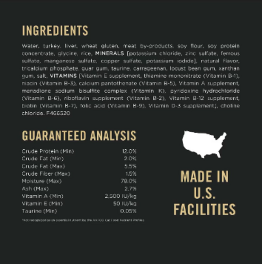 Water sufficient for processing, turkey, liver, wheat gluten, meat by products, rice, soy flour, soy protein concentrate, artificial and natural flavors, potassium chloride, calcium phosphate, guar gum, taurine, locust bean gum, xanthan gum, carrageenan, salt, choline chloride, Vitamin E supplement, thiamine mononitrate, zinc sulfate, ferrous sulfate, niacin, calcium pantothenate, Vitamin A supplement, menadione sodium bisulfite complex (source of Vitamin K activity), copper sulfate, manganese sulfate, pyridoxine hydrochloride, riboflavin supplement, Vitamin B 12 supplement, biotin, folic acid, Vitamin D 3 supplement, and potassium iodide
