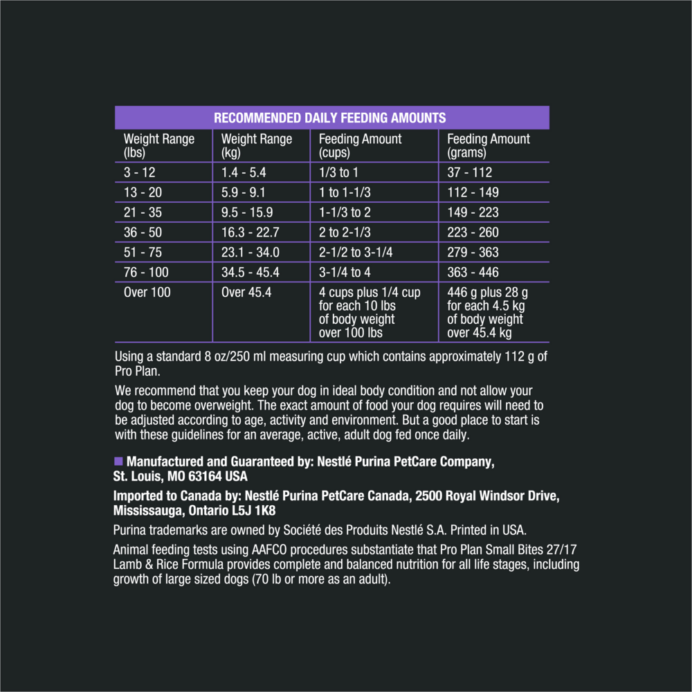 Give your dog targeted nutrition at every age with Purina Pro Plan Brand Dog Food Small Bites 27/17 Lamb and Rice Formula dry dog food. The nutrient-dense bite-sized kibble is designed for dogs who prefer eating smaller pieces, and rice and oatmeal offer easily digestible sources of energy. Each serving contains high-quality protein, including lamb as the first ingredient, and the antioxidant-rich formula helps to support your dog's healthy immune system. Real meat in this nutritious formula helps provide for your dog's protein needs. Formulated to provide specialized nutrition for an exceptional life, this Purina Pro Plan super-premium dry dog food follows your canine companion from his playful puppy years through adulthood. Offer up this tasty food for dogs to give your best buddy the nutrition he needs that is manufactured by a pet food brand you can trust.