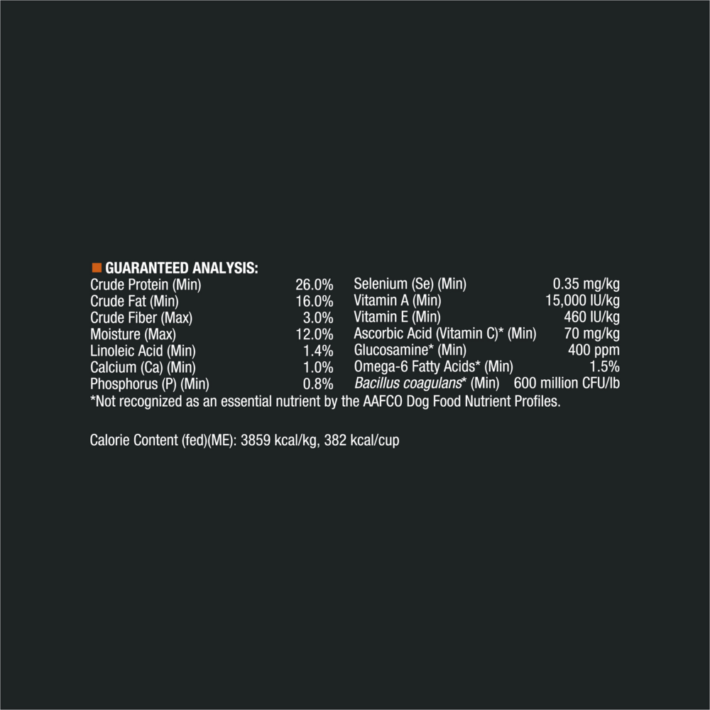 Beef, rice, whole grain wheat, corn gluten meal, poultry by-product meal (source ofglucosamine), soybean meal, whole grain corn, beef fat preserved with mixed-tocopherols, dried eggproduct, dried beet pulp, fish meal (source of glucosamine), natural flavor, glycerin, calcium carbonate,wheat bran, mono and dicalcium phosphate, soybean oil, salt, potassium chloride, VITAMINS [Vitamin Esupplement, niacin (Vitamin B-3), Vitamin A supplement, calcium pantothenate (Vitamin B-5), thiaminemononitrate (Vitamin B-1), Vitamin B-12 supplement, riboflavin supplement (Vitamin B-2), pyridoxinehydrochloride (Vitamin B-6), folic acid (Vitamin B-9), Vitamin D-3 supplement, menadione sodium bisulfitecomplex (Vitamin K), biotin (Vitamin B-7)], MINERALS [zinc proteinate, manganese proteinate, ferroussulfate, copper proteinate, calcium iodate, sodium selenite], choline chloride, L-ascorbyl-2-polyphosphate(Vitamin C), dried Bacillus coagulans fermentation product, garlic oil.
