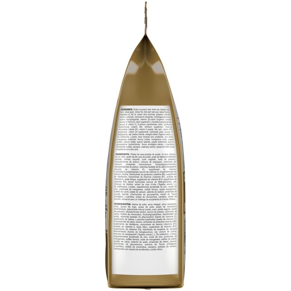 Chicken By-Product Meal, Brown Rice, Brewers Rice, Corn, Wheat Gluten, Chicken Fat, Dried Plain Beet Pulp, Natural Flavors, Vegetable Oil, Fish Oil, Sodium Silico Aluminate, Potassium Chloride, Calcium Carbonate, Monocalcium Phosphate, Fructooligosaccharides, Sodium Tripolyphosphate, Vitamins [DL-Alpha Tocopherol Acetate (Source Of Vitamin E), Niacin Supplement, L-Ascorbyl-2-Polyphosphate (Source Of Vitamin C), D-Calcium Pantothenate, Biotin, Pyridoxine Hydrochloride (Vitamin B6), Riboflavin Supplement, Thiamine Mononitrate (Vitamin B1), Vitamin A Acetate, Folic Acid, Vitamin B12 Supplement, Vitamin D3 Supplement], Hydrolyzed Yeast (Source Of Betaglucans), Salt, Choline Chloride, Marigold Extract (Tagetes Erecta L.), DL-Methionine, L-Lysine, Trace Minerals [Zinc Proteinate, Zinc Oxide, Manganese Proteinate, Ferrous Sulfate, Manganous Oxide, Copper Sulfate, Calcium Iodate, Sodium Selenite, Copper Proteinate], Taurine, Glucosamine Hydrochloride, Yucca Schidigera Extract, L-Carnitine, Chondroitin Sulfate, Carotene, Rosemary Extract, Preserved With Mixed Tocopherols And Citric Acid