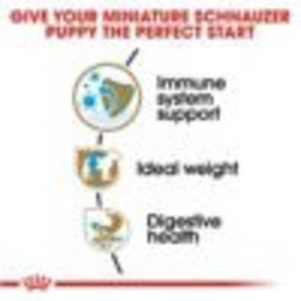 Over the last 40 years, Royal Canin has been committed to Health Nutrition with the aim of providing more precise nutritional answers, adapted to the specific needs of cats & dogs. Breed Health Nutrition: Tailor-made nutrition for pure breed dogs. An exclusive kibble for each breed: a concentration of technical expertise born from the unique knowledge of Royal Canin combined with the practical experience of breeders. Exclusive kibble: This exclusive kibble has been developed to be perfectly adapted to the jaw of the Miniature Schnauzer puppy. It makes it easier for the Miniature Schnauzer to pick up and encourages him to chew. Ideal Weight: Excess weight gain can effect the health of the Miniature Schnauzer puppy. An appropriate balanced food is therefore necessary for their health. Miniature Schnauzer Puppy helps support harmonious growth while maintaining ideal weight with a reduced fat content (-30% compared to Mini Puppy). Enriched with L-carnitine. Digestive Health: Digestive health is essential during the puppy's growth period: the digestive system is not yet fully developed and cannot absorb nutrients in the same way as adult dogs. Miniature Schnauzer Puppy helps support digestive health and helps to maintain a balanced intestinal flora. Natural Defenses: During the growth period, the puppy's natural defenses are not fully developed yet. Prebiotics and an exclusive complex of antioxidants (vitamins E and C, lutein and taurine) contained in the Miniature Schnauzer Puppy formula helps to support the Miniature Schnauzer puppy's natural defenses. 100% Complete and Balanced Nutrition: Miniature Schnauzer Puppy Breed Health Nutrition is formulated to meet the nutritional levels established by the AAFCO (Association of American Feed Control Officials) Dog Food Nutrient Profiles for growth. Royal Canin Miniature Schnauzer Puppy dry dog food is designed to meet the nutritional needs of purebred Miniature Schnauzers 8 weeks to 10 months old Exclusive small-shaped kibble helps Miniature Schnauzers pick up and chew their food Helps support puppy’s developing immune system and natural defenses with an exclusive complex of antioxidants including vitamin E Promotes a healthy weight during puppy’s growth with precise nutrients, moderate fat levels, and added L-carnitine Supports digestion and promotes optimal stool quality with high-quality proteins and prebiotics
