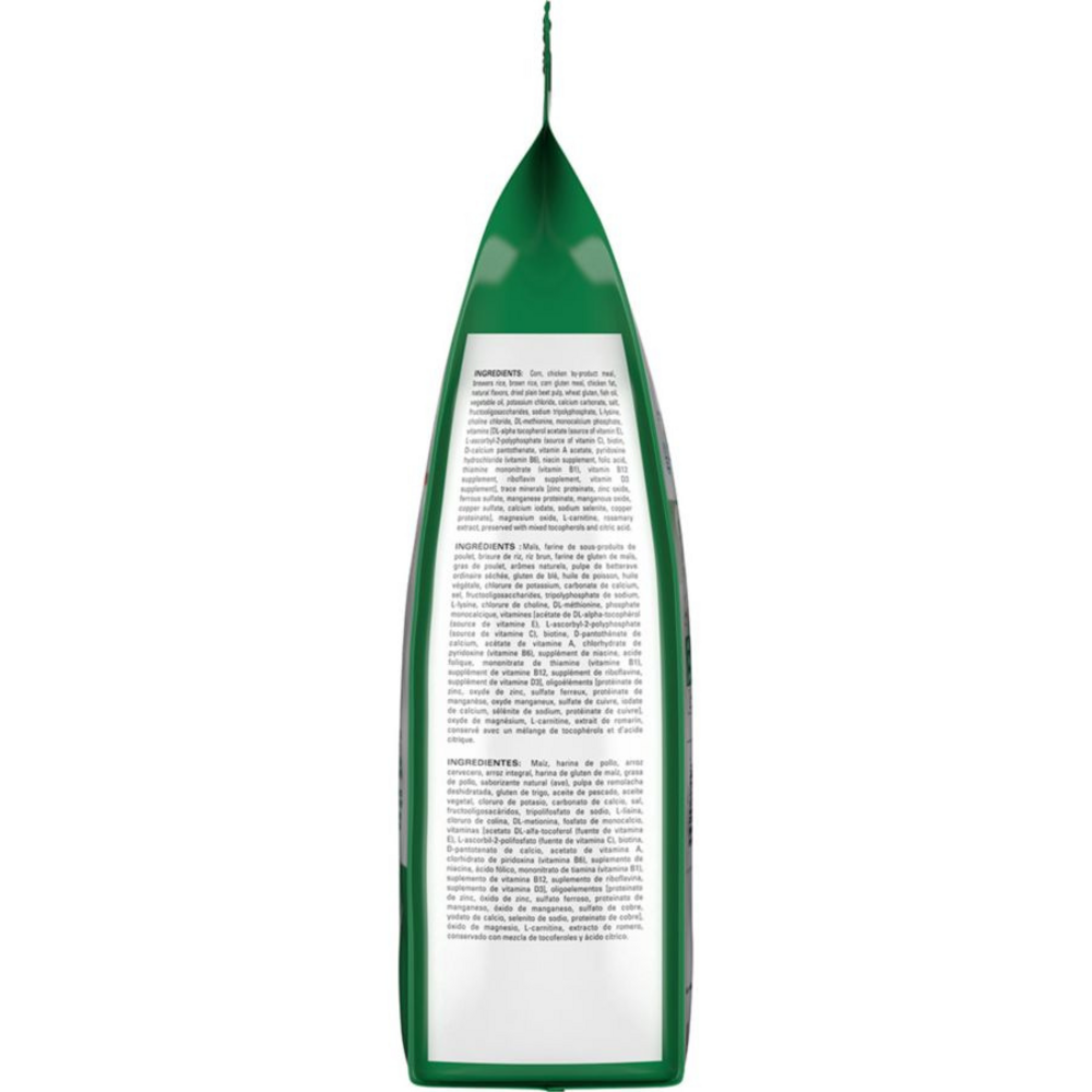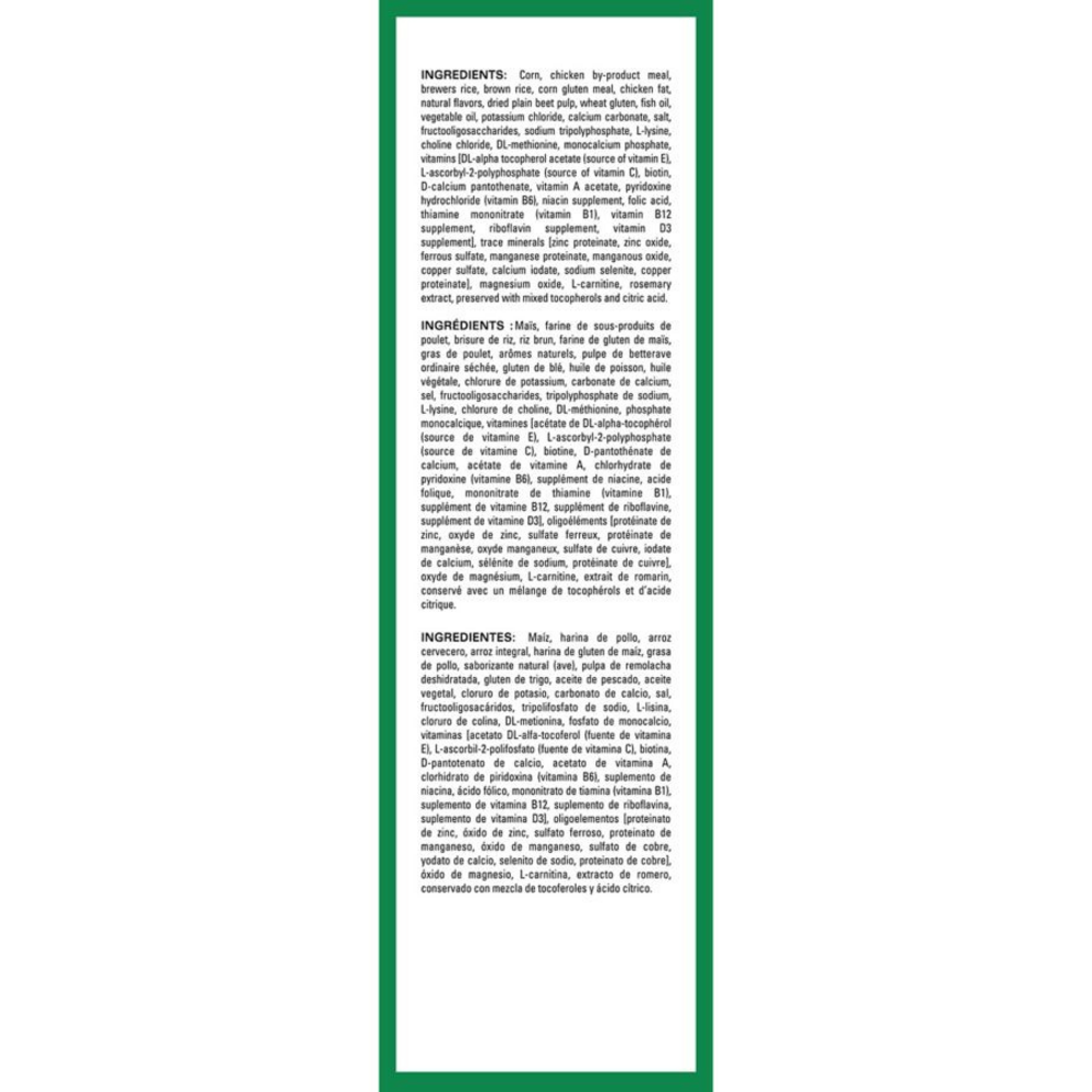 Corn, chicken by-product meal, brewers rice, brown rice, corn gluten meal, chicken fat, natural flavors, dried plain beet pulp, wheat gluten, fish oil, vegetable oil, potassium chloride, calcium carbonate, salt, fructooligosaccharides, sodium tripolyphosphate, L-lysine, choline chloride, DL-methionine, monocalcium phosphate, vitamins [DL-alpha tocopherol acetate (source of vitamin E), L-ascorbyl-2-polyphosphate (source of vitamin C), biotin, D-calcium pantothenate, vitamin A acetate, pyridoxine hydrochloride (vitamin B6), niacin supplement, folic acid, thiamine mononitrate (vitamin B1), vitamin B12 supplement, riboflavin supplement, vitamin D3 supplement], trace minerals [zinc proteinate, zinc oxide, ferrous sulfate, manganese proteinate, manganous oxide, copper sulfate, calcium iodate, sodium selenite, copper proteinate], magnesium oxide, L-carnitine, rosemary extract, preserved with mixed tocopherols and citric acid.