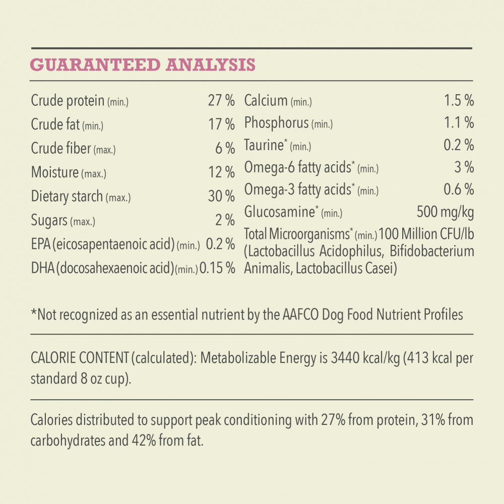 Deboned chicken, chicken meal, oat groats, whole sorghum, whole millet, eggs, catfish meal, chicken fat, whole oats, deboned turkey, chicken liver, fish oil, ground miscanthus grass, Natural chicken flavor, chicken cartilage, turkey giblets (liver, heart, gizzard), chicken heart, whole butternut squash, whole pumpkin, salt, potassium chloride, choline chloride, taurine, dried kelp, vitamin E supplement, mixed tocopherols (preservative), zinc proteinate, vitamin D3 supplement, vitamin A acetate, freeze-dried chicken liver, freeze-dried turkey liver, copper proteinate, niacin, thiamine mononitrate, riboflavin, calcium pantothenate, pyridoxine hydrochloride, folic acid, vitamin B12 supplement, chicory root, turmeric, sarsaparilla, althea root, rosehips, juniper berries, citric acid (preservative), rosemary extract, dried Lactobacillus acidophilus fermentation product, dried Bifidobacterium animalis fermentation product, dried Lactobacillus casei fermentation product.