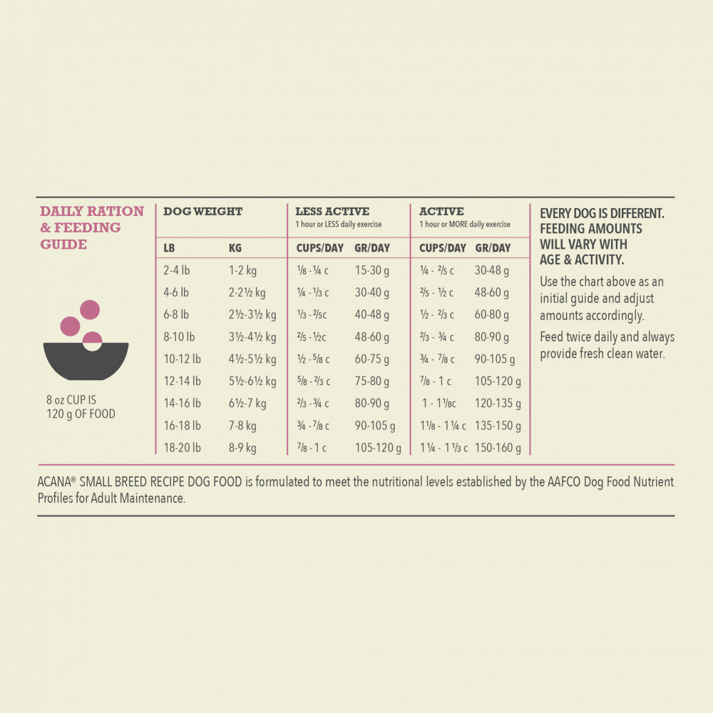 - One (1) 4 lb bag of ACANA Wholesome Grains Small Breed Recipe Dry Dog Food