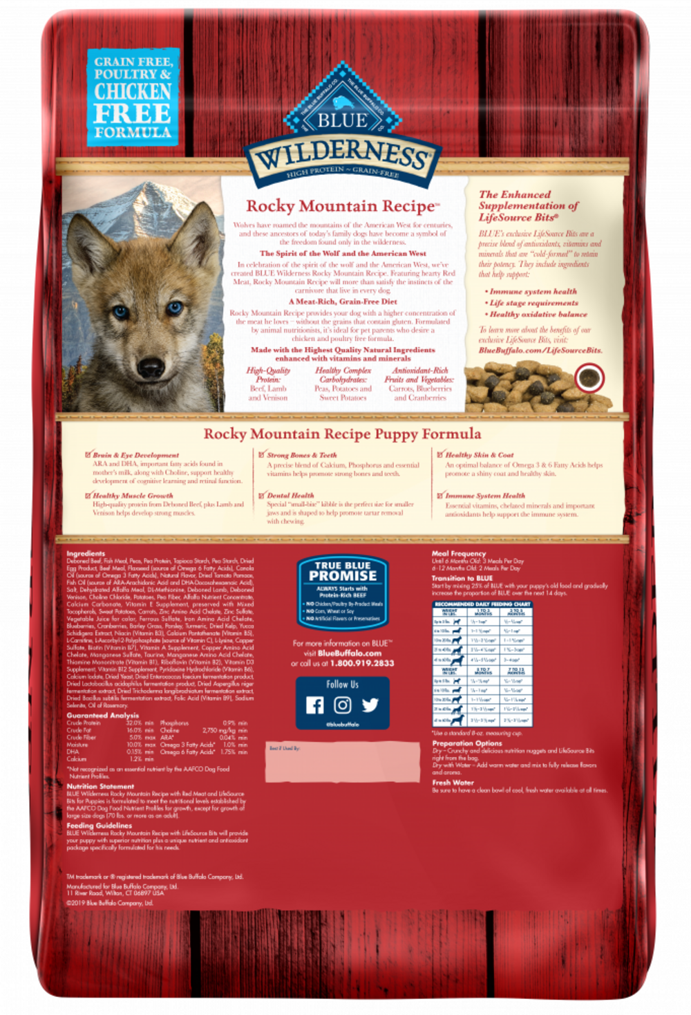 For centuries wolves have roamed the American West surviving on a diet provided solely by the wild. The spirit of the wolf lives on in dogs today and is the reason we created BLUE Wilderness Rocky Mountain Recipe Dog Food. Because puppyhood is such an important stage in any dog’s life, BLUE Wilderness for Puppies features ingredients that support healthy growth and development. BLUE Wilderness dog food is a product of the Blue Buffalo company. Based in the United States, Blue Buffalo makes premium-quality pet foods featuring real meat, fruit and vegetables.