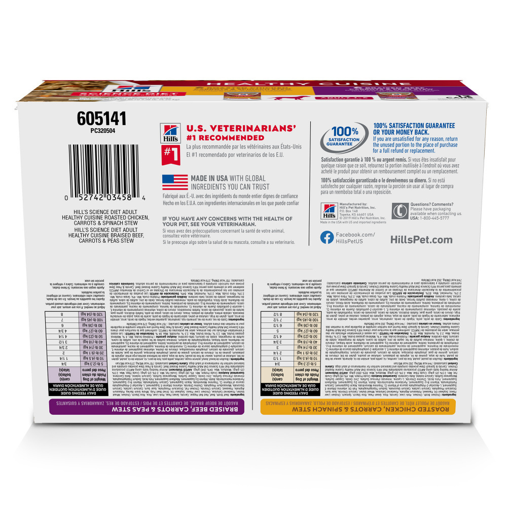 Give your dog the perfect balance of taste and nutrition in two different flavors with this Science Diet Healthy Cuisine variety pack. Combining braised beef or roasted chicken with tender vegetables in a succulent stew, both flavors of this dog food are made in the USA with global ingredients you can trust. Plus, they support lean muscles and a healthy immune system. Open up a can and serve either one of these mouthwatering stews as a balanced meal, or try on top of Science Diet dry dog food. Biology-based nutrition of Science Diet in a delicious wet dog food Variety pack of 12 cans in two flavors for adult dogs • High-quality protein for lean muscles • Clinically proven antioxidants for a healthy immune system • Purposeful ingredients for a flavorful, nutritious meal that’s easy to digest • Made in the USA with global ingredients you can trust • From Hill’s, the #1 Veterinarian Recommended pet food brand
