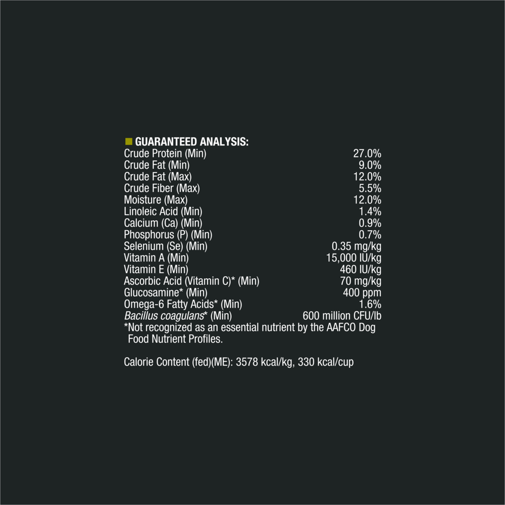 Chicken, Rice, Poultry By-Product Meal, Whole Grain Corn, Corn Protein Meal, Whole Grain Wheat, Corn Germ Meal, Barley, Dried Egg Product, Beef Fat Preserved With Mixed-Tocopherols, Natural Flavor, Fish Meal, Wheat Flour, Calcium Carbonate, Wheat Bran, Salt, Potassium Chloride, Mono And Dicalcium Phosphate, VITAMINS [Vitamin E Supplement, Niacin (Vitamin B-3), Vitamin A Supplement, Calcium Pantothenate (Vitamin B-5), Thiamine Mononitrate (Vitamin B-1), Vitamin B-12 Supplement, Riboflavin Supplement (Vitamin B-2), Pyridoxine Hydrochloride (Vitamin B-6), Folic Acid (Vitamin B-9), Menadione Sodium Bisulfite Complex (Vitamin K), Vitamin D-3 Supplement, Biotin (Vitamin B-7)], Choline Chloride, MINERALS [Zinc Sulfate, Ferrous Sulfate, Manganese Sulfate, Copper Sulfate, Calcium Iodate, Sodium Selenite], L-Lysine Monohydrochloride, Dried Bacillus Coagulans Fermentation Product, L-Ascorbyl-2-Polyphosphate (Vitamin C), Garlic Oil. V446223