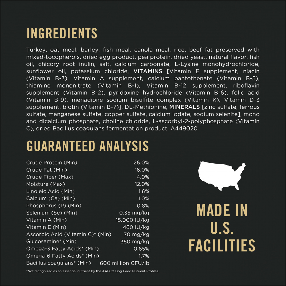 Nourish your dog's skin and coat and help support his digestive health with Purina Pro Plan SPECIALIZED Sensitive Skin and Stomach Turkey and Oat Meal Formula adult dry dog food. Real turkey is the number 1 ingredient in this wholesome, high protein dog food, and real oat meal is easy to digest and gentle on his sensitive stomach. Sunflower oil provides a rich source of omega-6 fatty acids to support his skin and coat, and omega-3 fatty acids from fish oil and glucosamine promote mobility and joint health for dogs. Our pet nutritionists fortify our sensitive stomach dog food to support healthy digestion and include natural prebiotic fiber to promote beneficial intestinal bacteria. Highly digestible for optimal nutrient delivery, our dry dog food for skin and coat care helps your pal get the maximum benefits from every serving. Plus, antioxidants in this dog food kibble help support a healthy immune system. You can feel confident filling your dog’s bowl knowing our complete and balanced adult dog food for sensitive skin has no corn, wheat, soy, or artificial colors or flavors to meet your ingredient preferences. We produce this sensitive skin dog food with pride in Purina-owned, U.S. facilities for quality and safety.