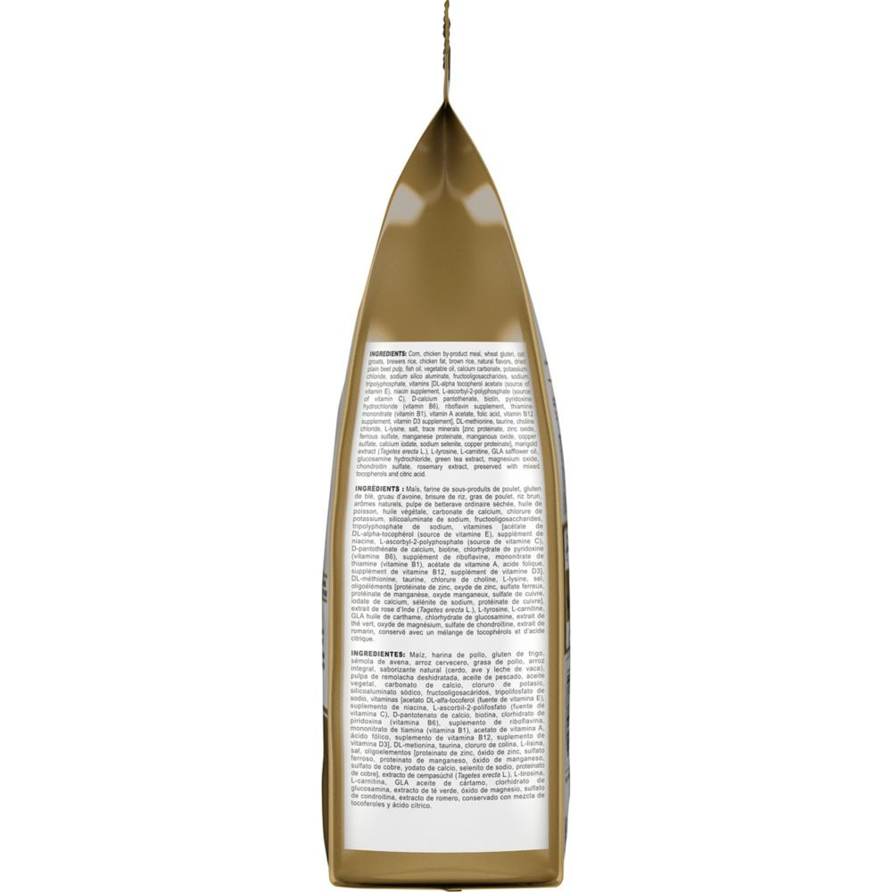 Corn, chicken by-product meal, wheat gluten, oat groats, brewers rice, chicken fat, brown rice, natural flavors, dried plain beet pulp, fish oil, vegetable oil, calcium carbonate, potassium chloride, sodium silico aluminate, fructooligosaccharides, sodium tripolyphosphate, vitamins [DL-alpha tocopherol acetate (source of vitamin E), niacin supplement, L-ascorbyl-2-polyphosphate (source of vitamin C), D-calcium pantothenate, biotin, pyridoxine hydrochloride (vitamin B6), riboflavin supplement, thiamine mononitrate (vitamin B1), vitamin A acetate, folic acid, vitamin B12 supplement, vitamin D3 supplement], DL-methionine, taurine, choline chloride, L-lysine, salt, trace minerals [zinc proteinate, zinc oxide, ferrous sulfate, manganese proteinate, manganous oxide, copper sulfate, calcium iodate, sodium selenite, copper proteinate], marigold extract (Tagetes erecta L.), L-tyrosine, L-carnitine, GLA safflower oil, glucosamine hydrochloride, green tea extract, magnesium oxide, chondroitin sulfate, rosemary extract, preserved with mixed tocopherols and citric acid.