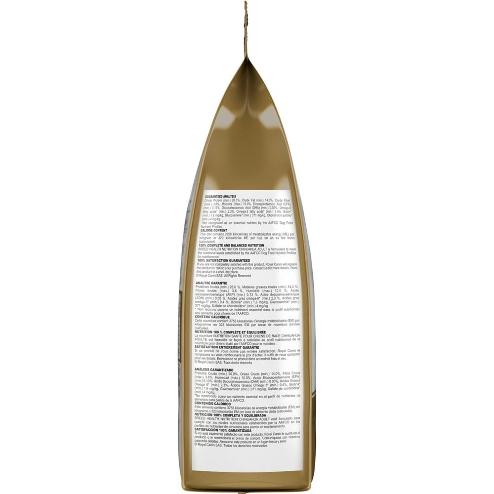 Royal Canin knows what makes your Chihuahua magnificent is in the details. While Chihuahuas might be one of the smallest breeds in the world, these protective little pooches have big nutritional needs. They can benefit from the right diet to aid digestion, maintain a healthy coat, and satisfy their finicky appetites. Royal Canin Chihuahua Adult dog food is tailor-made nutrition created just for your pure breed Chihuahua. Whether you have a deer head, apple head, fawn, or teacup, this exclusive breed-specific diet is uniquely formulated for your Chihuahua, with the specific nutrients to help them thrive. The customized small-sized kibble is specially designed for your Chihuahua’s pointed muzzle and tiny jaw, making it easy for them to pick up and chew. Highly digestible proteins and precise fiber content support healthy digestion to promote optimal stool quality and reduce unpleasant stool odors. Optimal levels of EPA, DHA, and biotin give your Chihuahua’s smooth or long coat a beautiful shine. And the combination of kibble size, exceptional aromas, and flavors is sure to please. Mix in or complement with Royal Canin Chihuahua wet dog food for extra reinforcement when it comes to fussy eaters. Once your Chihuahua is over 8 years old, transition them to Royal Canin Chihuahua Adult 8+ dry dog food for precise nutrition into the golden years. With nearly 50 years of scientific research and observation, Royal Canin continues to deliver targeted nutrition to feed every pet’s magnificence. Not satisfied? Then neither are we. Our breed health formulas are 100% satisfaction guaranteed. (Just contact us for more details.Royal Canin Chihuahua Adult dry dog food is designed to meet the nutritional needs of purebred Chihuahuas 8 months and olderExclusive tailor-made kibble helps Chihuahuas easily pick up and chew their foodHelps reduce stool odor with highly digestible proteins and precise fiber contentSupports coat health with omega-3 EPA and DHA and biotinHigh palatability with exceptional aromas and flavors to satisfy picky appetites