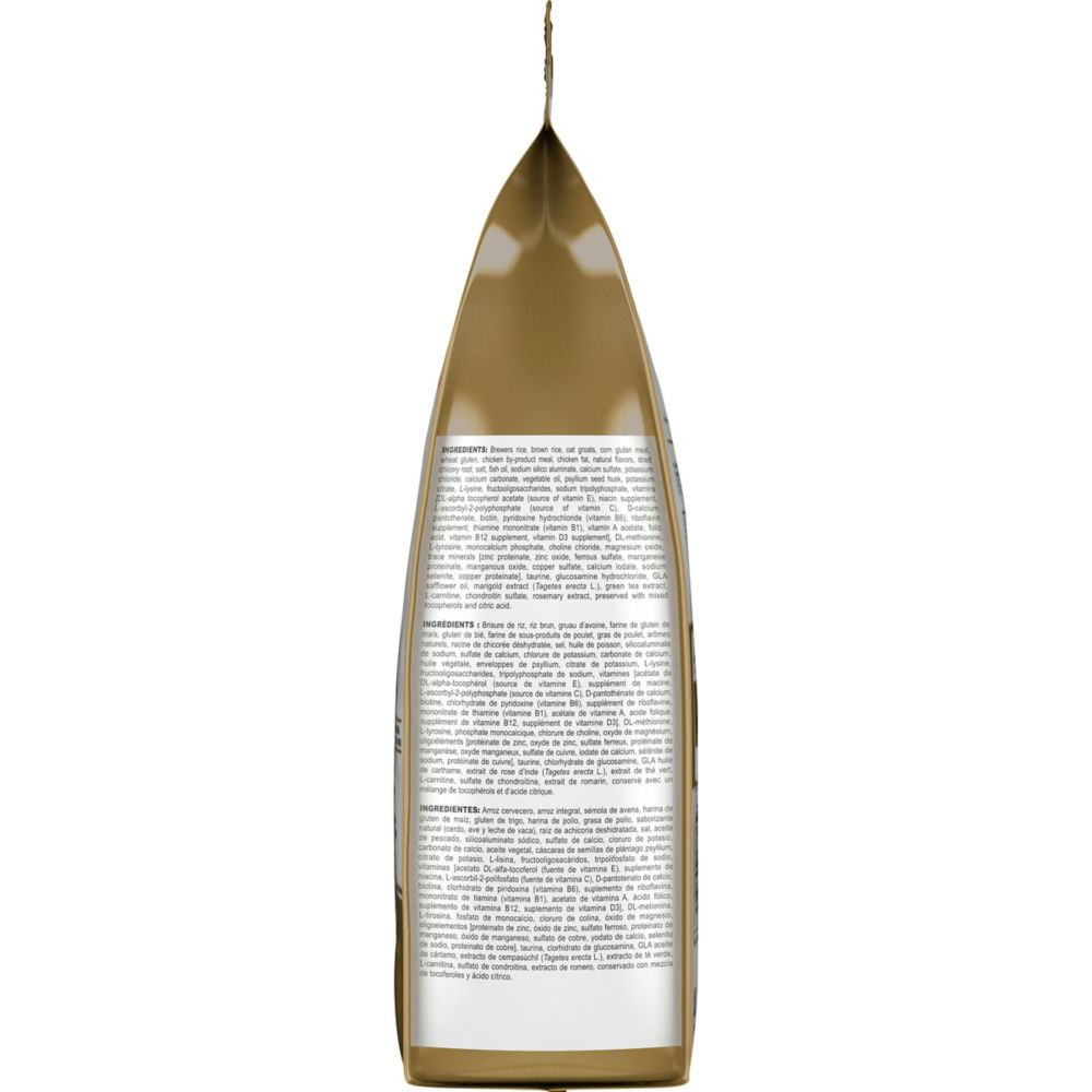 Brewers rice, brown rice, oat groats, corn gluten meal, wheat gluten, chicken by-product meal, chicken fat, natural flavors, dried chicory root, salt, fish oil, sodium silico aluminate, calcium sulfate, potassium chloride, calcium carbonate, vegetable oil, psyllium seed husk, potassium citrate, L-lysine, fructooligosaccharides, sodium tripolyphosphate, vitamins [DL-alpha tocopherol acetate (source of vitamin E), niacin supplement, L-ascorbyl-2-polyphosphate (source of vitamin C), D-calcium pantothenate, biotin, pyridoxine hydrochloride (vitamin B6), riboflavin supplement, thiamine mononitrate (vitamin B1), vitamin A acetate, folic acid, vitamin B12 supplement, vitamin D3 supplement], DL-methionine, L-tyrosine, monocalcium phosphate, choline chloride, magnesium oxide, trace minerals [zinc proteinate, zinc oxide, ferrous sulfate, manganese proteinate, manganous oxide, copper sulfate, calcium iodate, sodium selenite, copper proteinate], taurine, glucosamine hydrochloride, GLA safflower oil, marigold extract (Tagetes erecta L.), green tea extract, L-carnitine, chondroitin sulfate, rosemary extract, preserved with mixed tocopherols and citric acid.