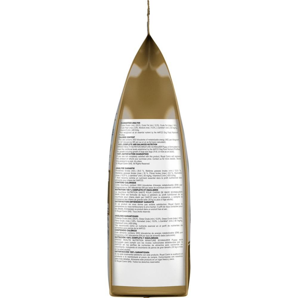 Over the last 40 years, Royal Canin has been committed to Health Nutrition with the aim of providing more precise nutritional answers, adapted to the specific needs of cats & dogs. Breed Health Nutrition: Tailor-made nutrition for pure breed dogs. An exclusive kibble for each breed: a concentration of technical expertise born from the unique knowledge of Royal Canin combined with the practical experience of breeders. Exclusive kibble: This exclusive kibble has been developed to be perfectly adapted to the jaw of the Miniature Schnauzer puppy. It makes it easier for the Miniature Schnauzer to pick up and encourages him to chew. Ideal Weight: Excess weight gain can effect the health of the Miniature Schnauzer puppy. An appropriate balanced food is therefore necessary for their health. Miniature Schnauzer Puppy helps support harmonious growth while maintaining ideal weight with a reduced fat content (-30% compared to Mini Puppy). Enriched with L-carnitine. Digestive Health: Digestive health is essential during the puppy's growth period: the digestive system is not yet fully developed and cannot absorb nutrients in the same way as adult dogs. Miniature Schnauzer Puppy helps support digestive health and helps to maintain a balanced intestinal flora. Natural Defenses: During the growth period, the puppy's natural defenses are not fully developed yet. Prebiotics and an exclusive complex of antioxidants (vitamins E and C, lutein and taurine) contained in the Miniature Schnauzer Puppy formula helps to support the Miniature Schnauzer puppy's natural defenses. 100% Complete and Balanced Nutrition: Miniature Schnauzer Puppy Breed Health Nutrition is formulated to meet the nutritional levels established by the AAFCO (Association of American Feed Control Officials) Dog Food Nutrient Profiles for growth. Royal Canin Miniature Schnauzer Puppy dry dog food is designed to meet the nutritional needs of purebred Miniature Schnauzers 8 weeks to 10 months old Exclusive small-shaped kibble helps Miniature Schnauzers pick up and chew their food Helps support puppy’s developing immune system and natural defenses with an exclusive complex of antioxidants including vitamin E Promotes a healthy weight during puppy’s growth with precise nutrients, moderate fat levels, and added L-carnitine Supports digestion and promotes optimal stool quality with high-quality proteins and prebiotics