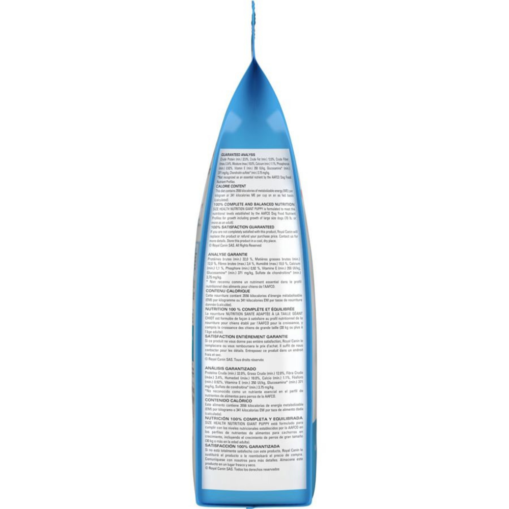 Your giant puppy is destined for big things—and as they grow, they have big nutritional needs. Giant breed dogs have the longest growth period out of other sized dogs—that’s why Royal Canin growth formulas for giant-sized dogs come in two stages: Giant Puppy and Giant Junior. This Giant Puppy dry dog food is made specifically for the first stage (up to 8 months). As they grow in size, their bones and joints are building a foundation for their giant frame. What you feed them now sets them up for a healthy, happy life as an adult.Royal Canin Giant Puppy dry dog food is targeted nutrition made for your lovable giant. Its precise calcium and phosphorus content helps promote strong bones and joint health, while key antioxidants and minerals support their developing immune systems and keep their bodies growing strong. Highly digestible proteins and prebiotic ingredients also help break down food while promoting healthy digestion and optimal stools. This exclusive kibble is designed specifically for your growing dog's large jaw to help them chew their kibble thoroughly.• FORMULATED FOR GIANT PUPPIES: Royal Canin Giant Puppy Dog Food is tailor-made for puppies up to 8 months old with an expected adult weight of over 100 lb• PUPPY NUTRITION: Meets the needs of large breed dogs during their uniquely extended growth period through key nutrients• BONE AND JOINT: Specialized blend of minerals promotes healthy bone and joint support• IMMUNE SUPPORT: An exclusive blend of antioxidants and vitamins supports healthy development of immune systems• OPTIMAL STOOL: Highly digestible proteins and prebiotics help promote optimal digestive health and stool quality