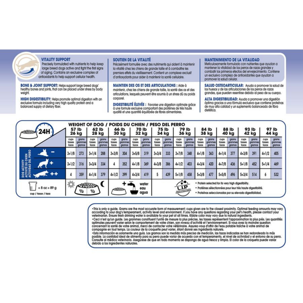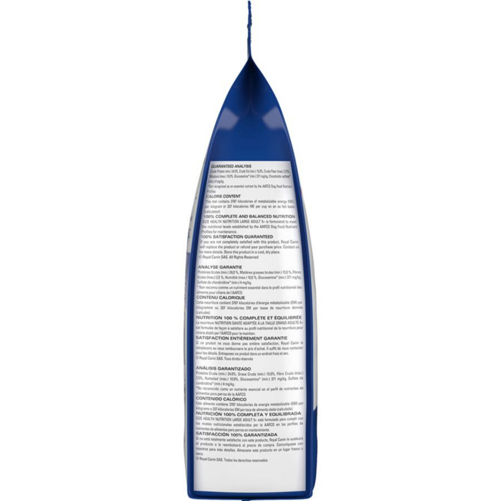 Large breed dogs are treasured for being hard working animals and loyal family companions. But as they age, their nutritional needs change. Their large bodies can benefit from a size-specific diet that can keep them happy and healthy, helping them maintain strong joints and large bones.Royal Canin Large Adult 5+ dry dog food (formerly Maxi Adult 5+) is tailored to support your big dog’s later years. An exclusive complex of antioxidants supports cellular health to help keep your dog going strong. Precise nutrients help keep large bones and joints healthy. Plus, high-quality proteins and a balanced blend of fibers help your big dog digest food easily for digestive health. Add some variety to their bowl with Royal Canin Adult wet dog food. And after your dog reaches their senior years, switch over to Royal Canin Large Aging 8+ for the right support large senior dogs need.• LARGE BREED DOG FOOD: Royal Canin Large Adult 5+ Dry Dog Food is precise nutrition specifically made for large dogs 5–7 years old weighing 56–100 lb• VITALITY SUPPORT: An exclusive blend of antioxidants for dogs fights the first signs of aging and supports long life vitality• BONE AND JOINT HEALTH: Mature dog food helps support bones and large breed joint health in older dogs• HEALTHY DIGESTION: Easy-to-digest high-quality proteins and a balanced supply of fiber promotes dog digestive health• SPECIALIZED KIBBLE: Highly palatable, large dog food kibble is specially designed for large adult dogs