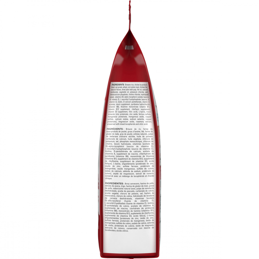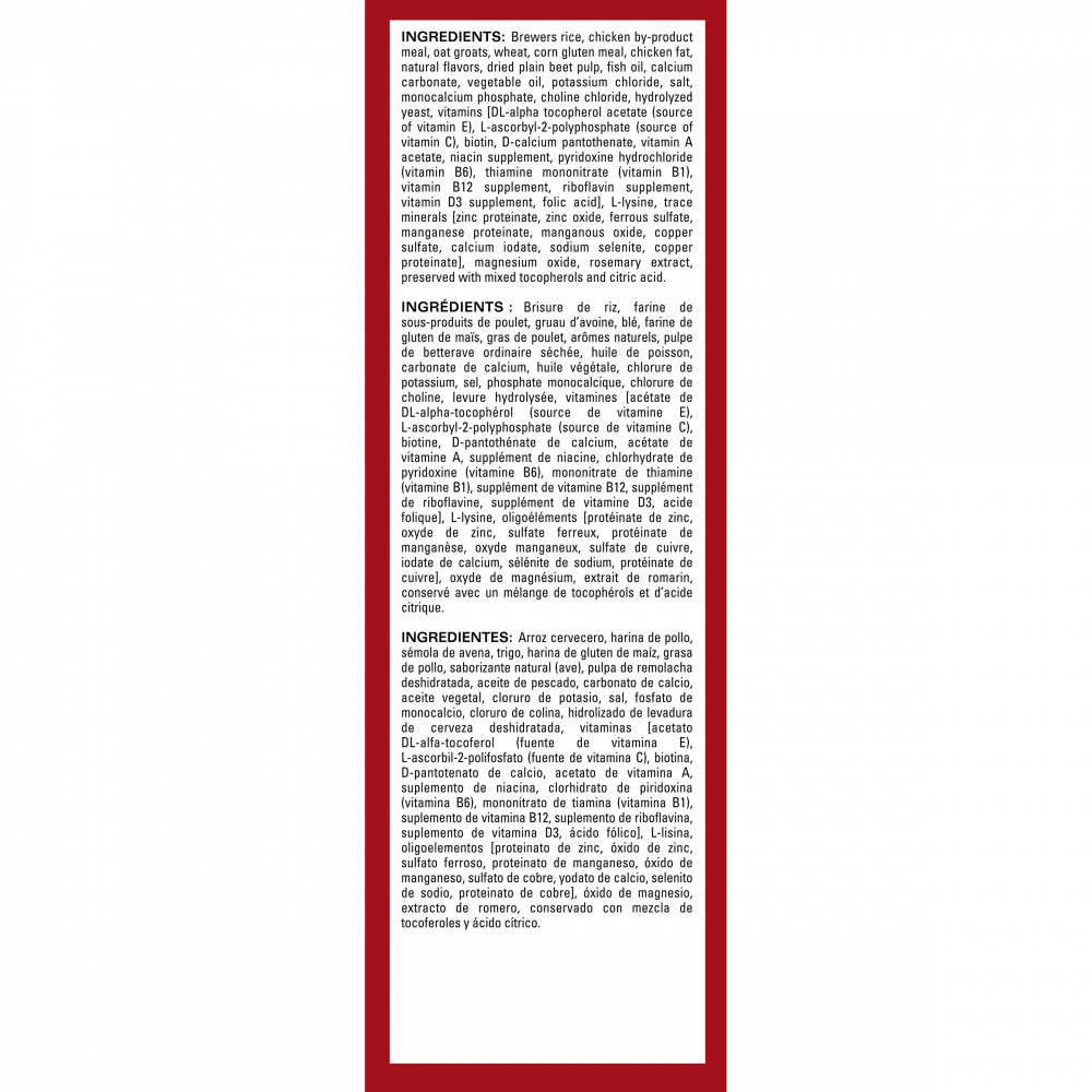 Brewers rice, chicken by-product meal, oat groats, wheat, corn gluten meal, chicken fat, natural flavors, dried plain beet pulp, fish oil, calcium carbonate, vegetable oil, potassium chloride, salt, monocalcium phosphate, choline chloride, hydrolyzed yeast, vitamins [DL-alpha tocopherol acetate (source of vitamin E), L-ascorbyl-2-polyphosphate (source of vitamin C), biotin, D-calcium pantothenate, vitamin A acetate, niacin supplement, pyridoxine hydrochloride (vitamin B6), thiamine mononitrate (vitamin B1), vitamin B12 supplement, riboflavin supplement, vitamin D3 supplement, folic acid], L-lysine, trace minerals [zinc proteinate, zinc oxide, ferrous sulfate, manganese proteinate, manganous oxide, copper sulfate, calcium iodate, sodium selenite, copper proteinate], magnesium oxide, rosemary extract, preserved with mixed tocopherols and citric acid.