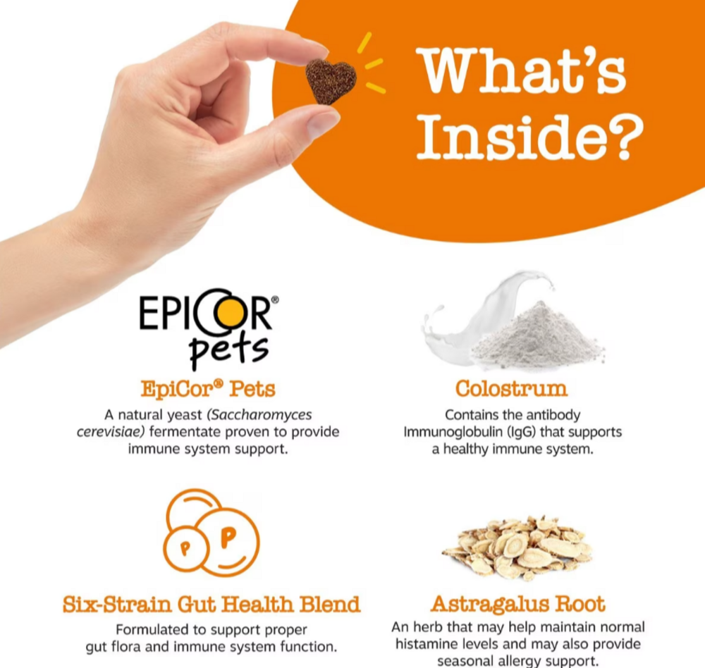 Pet parents care when sensitive skin or seasonal allergies give their dogs a hard time, but don't worry! Made with EpiCor®, wild-caught Alaskan Salmon Fish Oil (with omegas that support skin health), Colostrum, Astragalus Root, Probiotics, and Apple Cider Vinegar, this chewable formula provides seasonal allergy support, along with supporting normal immune function, skin health, and gut flora. These chews may also help maintain normal histamine levels for canine pets, no matter the breed and for all ages.
