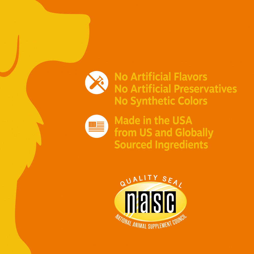 New Formula: Palm Fruit Oil, Pea Flour, VitaFiber (need ingredient declaration from supplier), Pumpkin, Garbanzo Flour, Tapioca Flour, Flaxseed, Natural Chicken Flavoring, Mineral Oil, Sunflower Lecithin, Coconut Glycerin, Dandelion Root, Nettle Root, Apple Pectin, Powdered Cellulose, Sorbic Acid, Rosemary Extract, Mixed Tocopherols. Old Formula: Prebiotic Fiber (VitaFiber), Pumpkin, Mineral Oil, Dandelion Root, Nettle Root, Apple Pectin, Vitamin E (d-alpha tocopherol), Bromelain (480 MCU per chew), Pea Flour, Palm Fruit Oil, Garbanzo Flour, Tapioca Flour, Flaxseed Meal, Natural Chicken Flavoring, Sunflower Lecithin, Coconut Glycerin, Powdered Cellulose (Coating Only), Rosemary Extract, Mixed Tocopherols, Sorbic Acid (Natural Preservative)