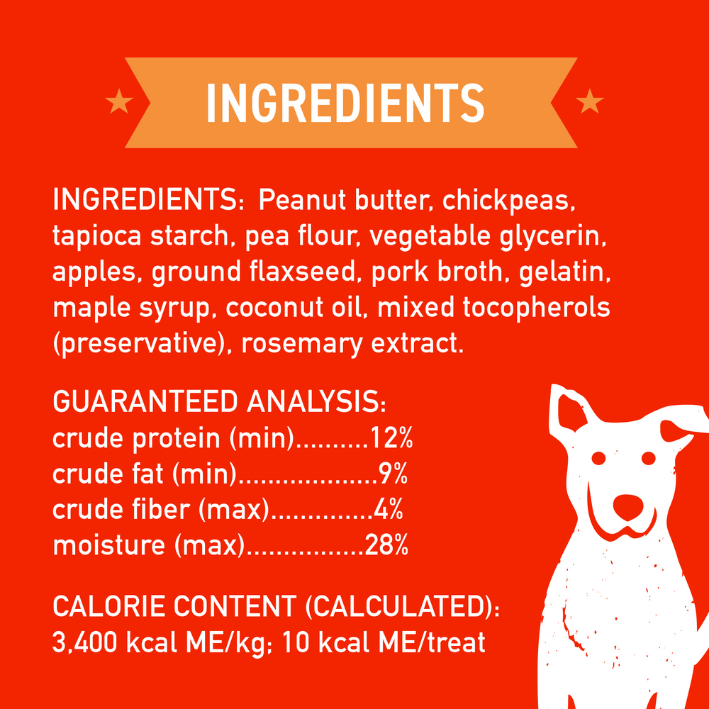 Peanut butter, chickpea flour, tapioca starch, pea flour, vegetable glycerin, apples, ground flaxseed, phosphoric acid, xanthan gum, maple syrup, sorbic acid (preservative), mixed tocopherols (preservative), rosemary extract.