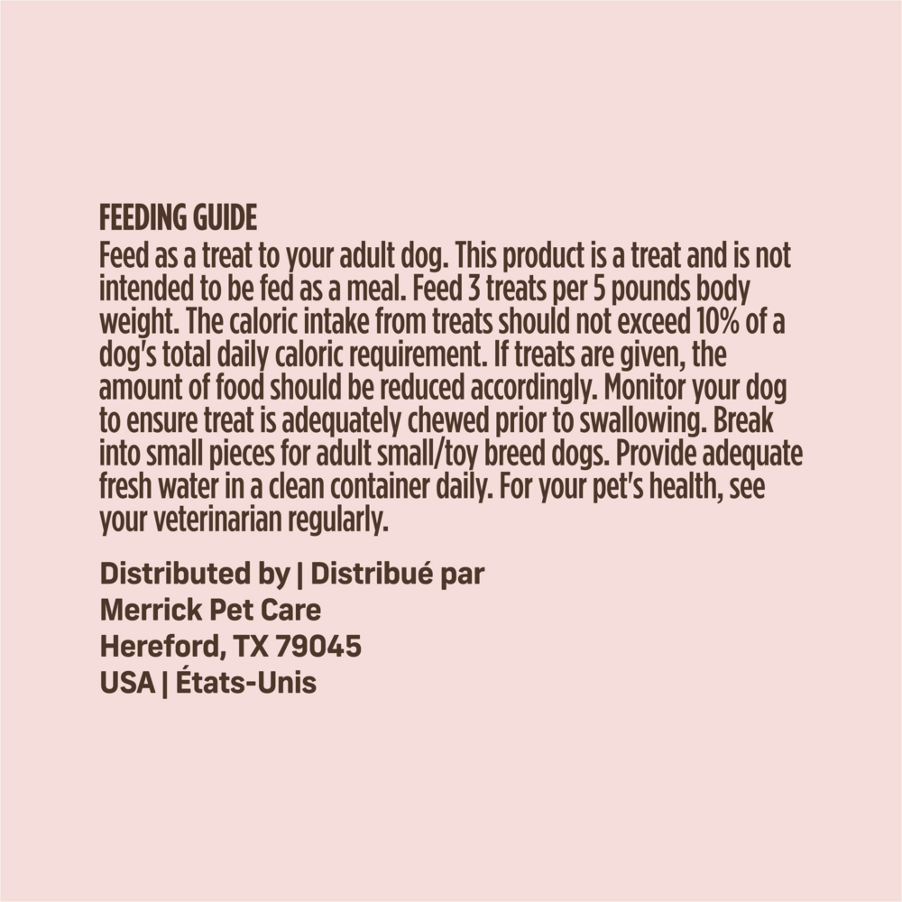 Merrick Power Bites are soft and chewy all-natural treats, with big taste and industry-leading levels of powerful protein packed into every bite. These treats are perfect for training and rewarding dogs. Power Bites start with real deboned meat as the #1 ingredient, with added nutrition from fresh fruits and vegetables. Power Bites are grain-free and gluten-free, without sorbic acid. Safely cooked in the USA with the world’s best ingredients!