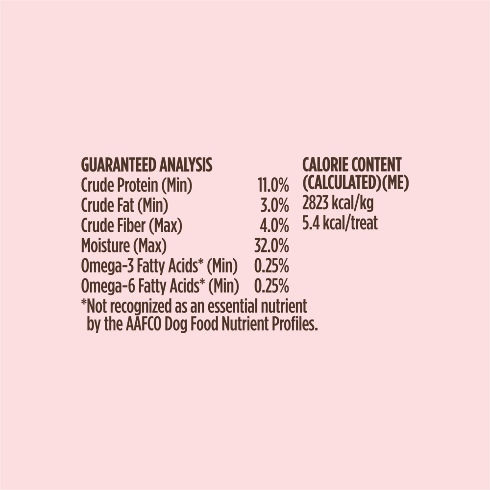 Deboned Beef, Potatoes, Peas, Potato Protein, Potato Starch, Organic Cane Molasses, Vegetable Glycerin, Brown Sugar, Gelatin, Cultured Skim Milk, Sunflower Lecithin, Phosphoric Acid, Salt, Potassium Chloride, Natural Smoke Flavor, Carrots, Apples, Blueberries, Mixed Tocopherols (a preservative), Rosemary Extract.
