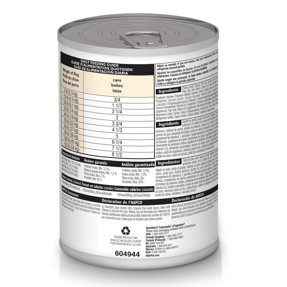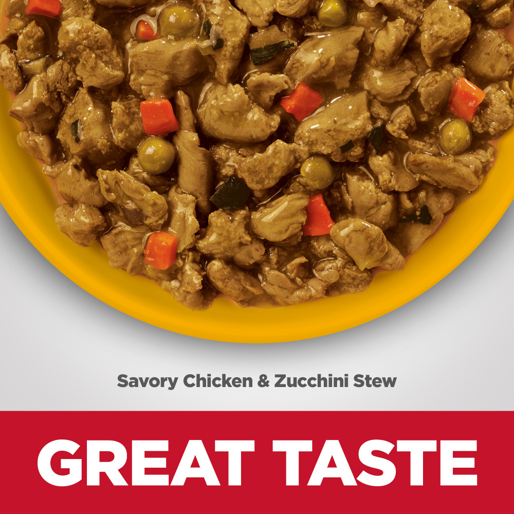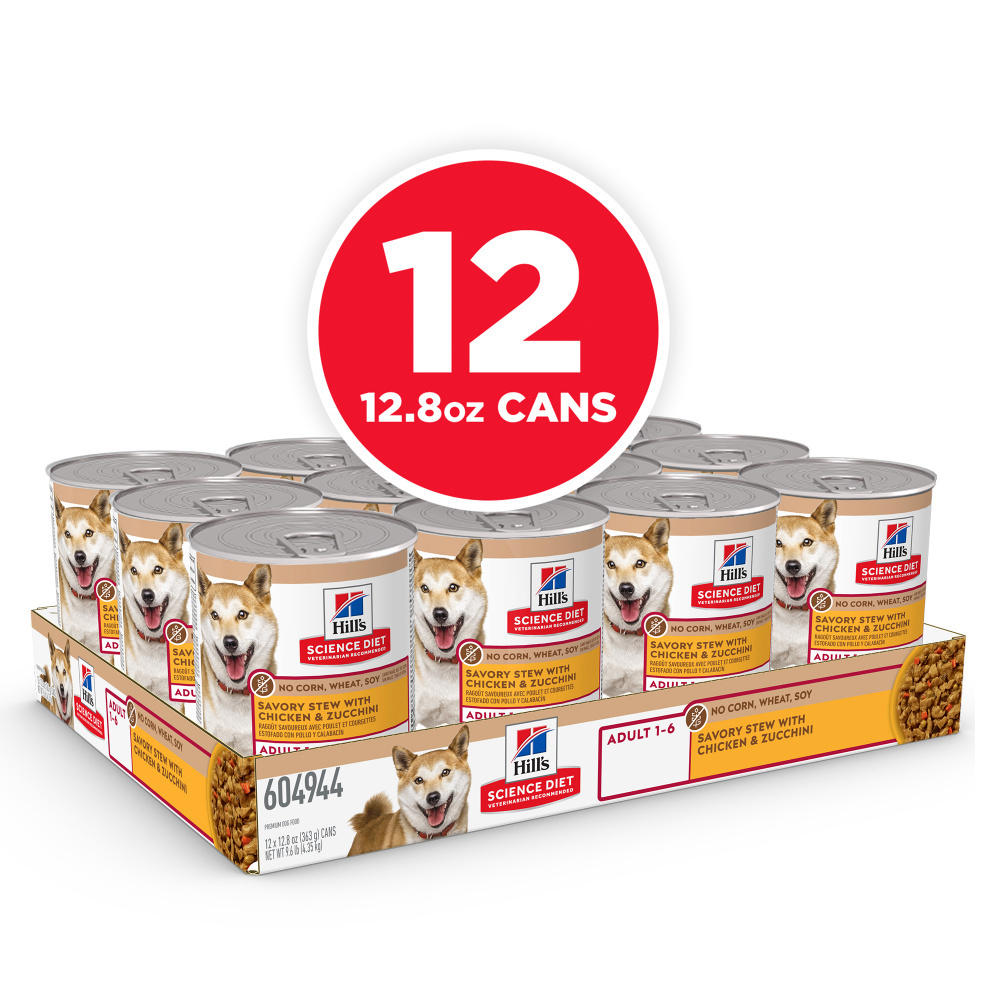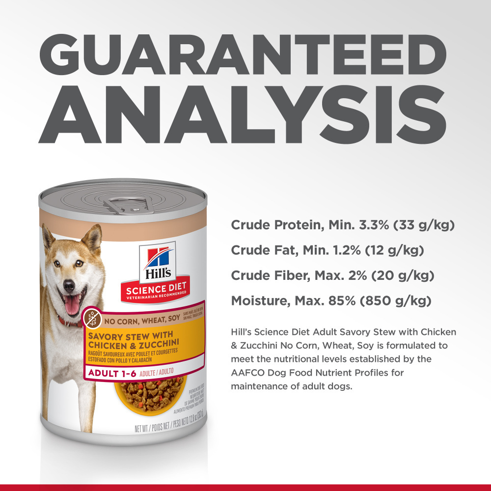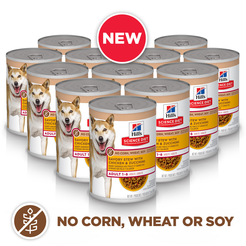 Now you can feed mouthwatering Hill’s Science Diet stews in recipes with no corn, wheat or soy. Tasty and nutritious, this canned dog food is made in the USA with global ingredients you can trust, including real chicken, brown rice and a medley of delectable vegetables, all smothered in a delicious gravy. Made with natural ingredients – plus added vitamins, minerals, and amino acids – this quality dog food uses high-quality protein for lean muscles, and is formulated with ingredients to support heart health. Feed Hill’s Science Diet No Corn, Wheat, Soy stews as a complete meal, or try them on top of Science Diet dry dog food. • Biology-based nutrition of Science Diet with no corn, wheat or soy • Delicious stew can be fed by itself or paired with Science Diet dry food • High-quality protein for lean muscles • Supports beautiful skin and coat, and is easy to digest • Canned dog food made with natural ingredients • Formulated with ingredients to support heart health From • Hill’s, the #1 Veterinarian Recommended pet food brand