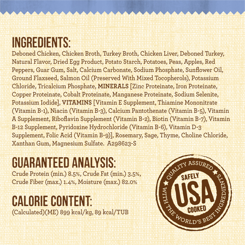 DEBONED CHICKEN, CHICKEN BROTH, TURKEY BROTH, CHICKEN LIVER, DEBONED TURKEY, DRIED EGG WHITES, POTATO STARCH, POTATOES, PEAS, APPLES, RED PEPPERS, GUAR GUM, SUNFLOWER OIL, SALMON OIL (PRESERVED WITH MIXED TOCOPHEROLS), TRICALCIUM PHOSPHATE, SODIUM PHOSPHATE, SALT, NATURAL FLAVOR, POTASSIUM CHLORIDE, MINERALS (ZINC AMINO ACID CHELATE, IRON AMINO ACID CHELATE, COPPER AMINO ACID CHELATE, MANGANESE AMINO ACID CHELATE, SODIUM SELENITE, COBALT AMINO ACID CHELATE, POTASSIUM IODIDE), GROUND FLAXSEED, CHOLINE CHLORIDE, VITAMINS (VITAMIN E SUPPLEMENT, THIAMINE MONONITRATE, NIACIN SUPPLEMENT, d-CALCIUM PANTOTHENATE, VITAMIN A SUPPLEMENT, RIBOFLAVIN SUPPLEMENT, BIOTIN, VITAMIN B12 SUPPLEMENT, PYRIDOXINE HYDROCHLORIDE (VITAMIN B6), VITAMIN D3 SUPPLEMENT, FOLIC ACID), XANTHAN GUM, ROSEMARY EXTRACTGuaranteed Analysis